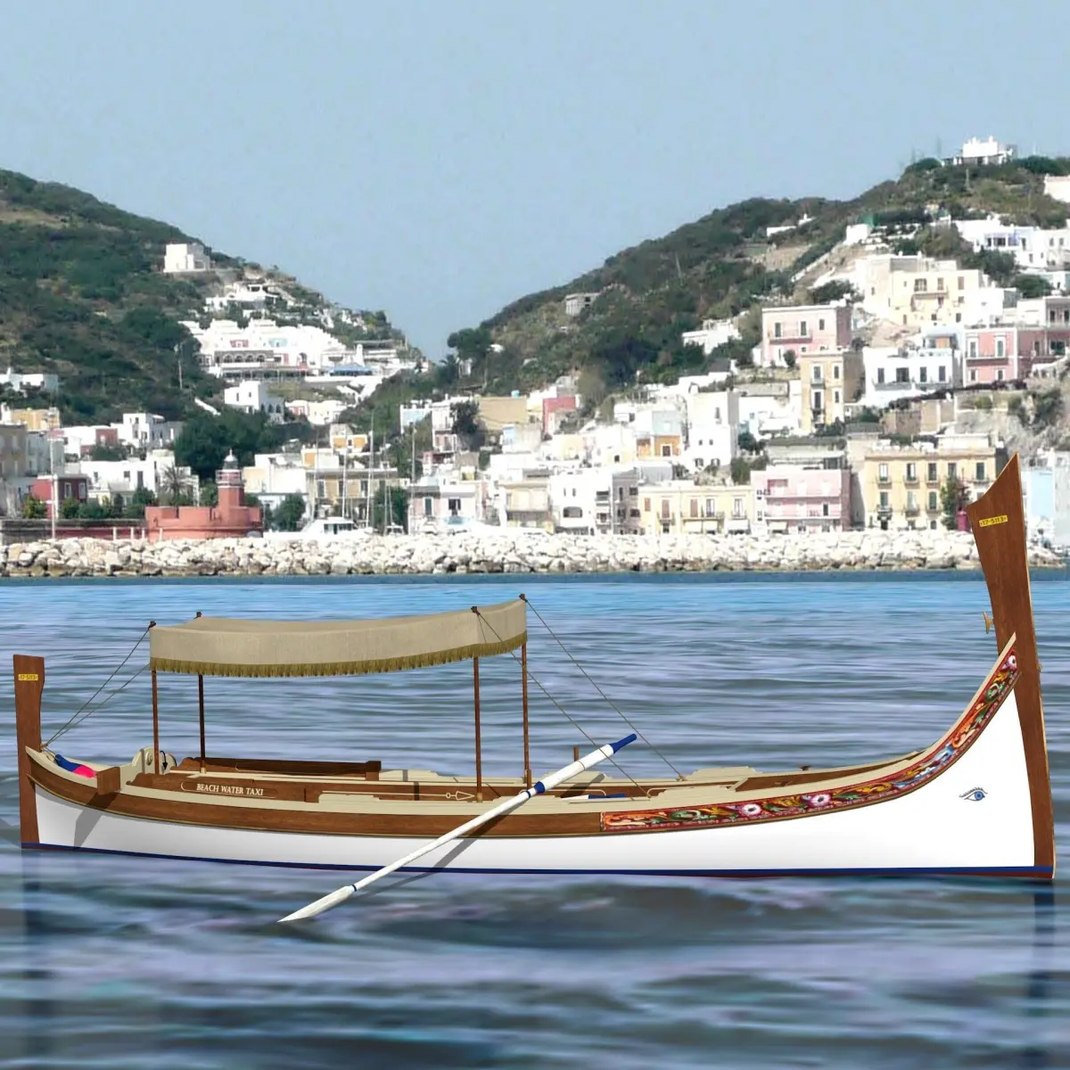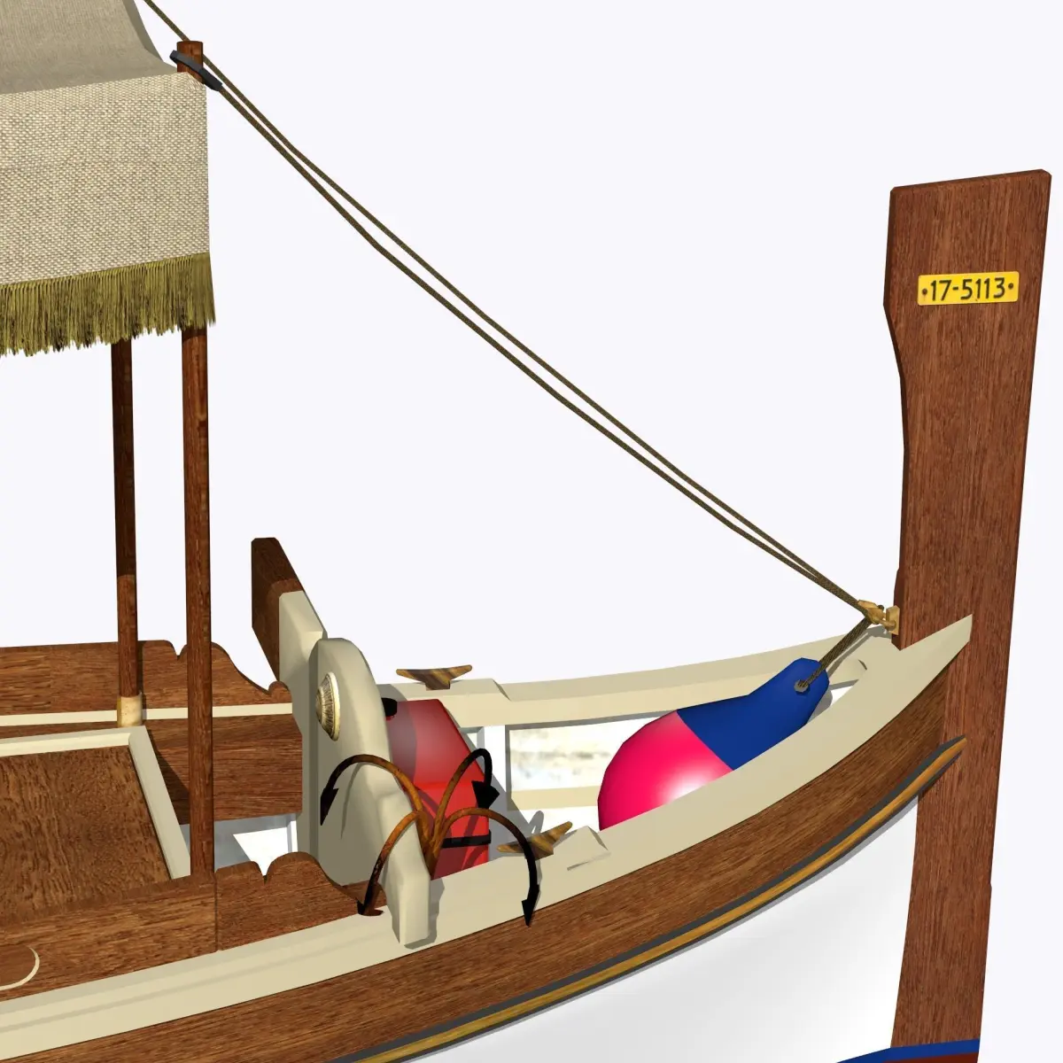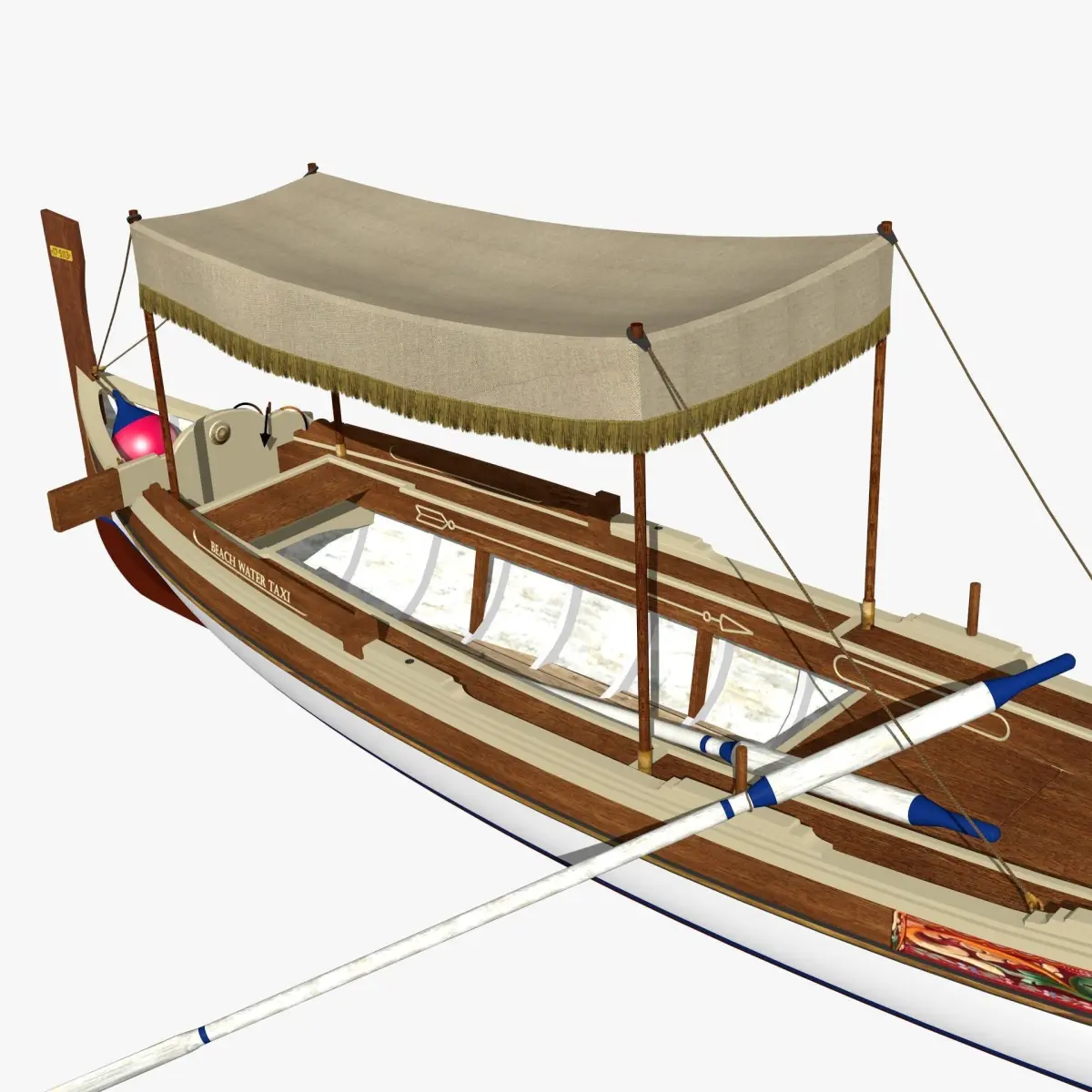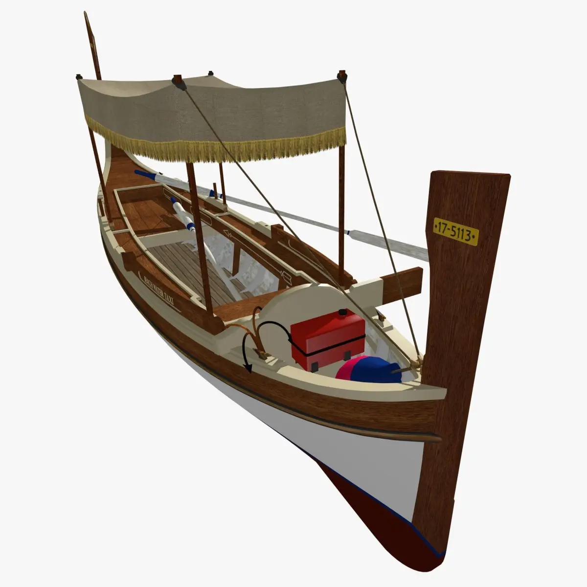 Dghajsa is a typical boat of Malta, the Mediterranean island. She is used as a fisdhing and pleasure boat and maily, now, as a sea Taxi, or for cerimonies.Her image is also present in the Malta symbol.She is a 6m wooden boat generally used with oars, but sometimes with a small outboard engine mounted on a side.She is very elegant and although shorter and using two oars, is very similar to Venetian Gondolas. The model has a very smooth and detailed hull, including inside frames. Accessories like anchor, buoy, fuel tank and tent are present. Although very well detailed, the model can be considered a Low Poly one due to limited number of vertices and dimension.