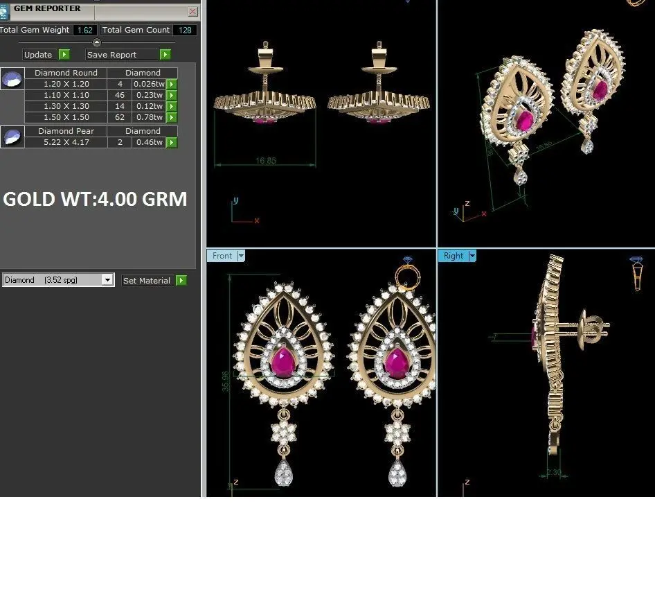 Design Master11provides solutions for cad, render, catalogue and model view for diamond jewellery designs. If you want any changes in this design please contact us, I will get back to you within 5-8 hours. This type of earring maybe called solitaire earring, stud earring, drop earring or halo earring. You can change the stone to round, emerald, heart, pear, princess so the earring will be called as round tone earring, emerald earring, heart earring, pear earring, and princess earring respectively.I have uploaded a render image of the product but you can change the color of stone as per your convenience. For example, if you don’t like the diamond earring, so you can add a red stone for the ruby earring, green stone for the emerald earring, yellow stone for citrin earring, blue stone for the sapphire earring. This is a complete fashion earring which you can wear in your everyday life. You can check some of the most famous earring: oval earring and flower earring