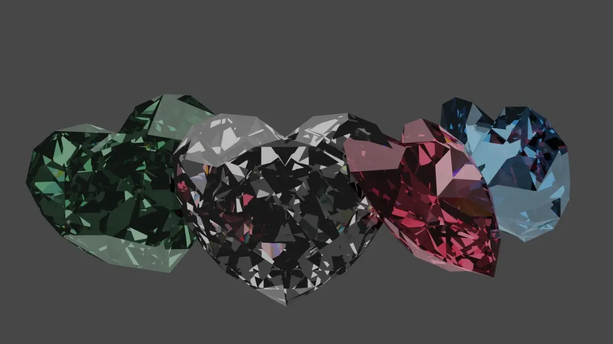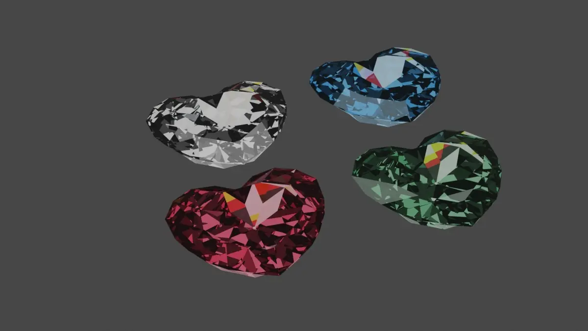 Heart Diamond, 4 colors: red, green, white, blue.Was modeled in Blender v3.3.1 and rendered with Cycles. Includes all shaders, used textures and the light setup.