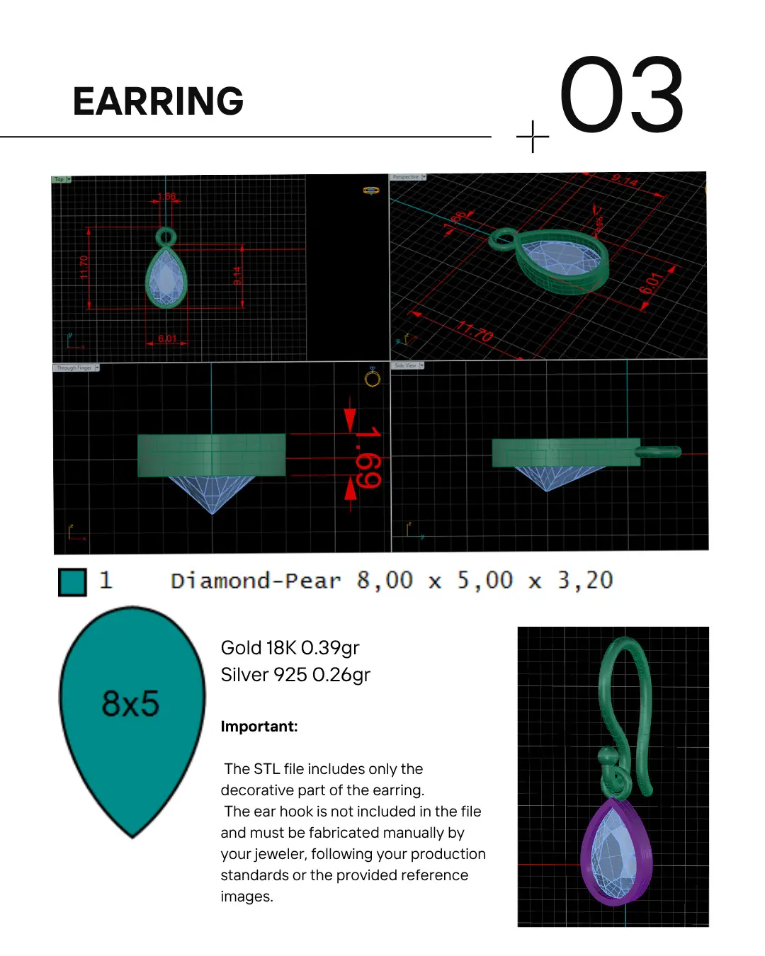 .3dm .stl Important: The STL file included only the decorative part of the earring. The ear hook is not included in the file and must be fabricated manually by your jeweler. following your production standards of the provided reference images.