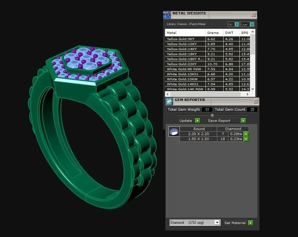 Gems: - Total gem count is 25 and total gem weight is .51. There are gems round 1.50, 2.20. More info in the picture above.