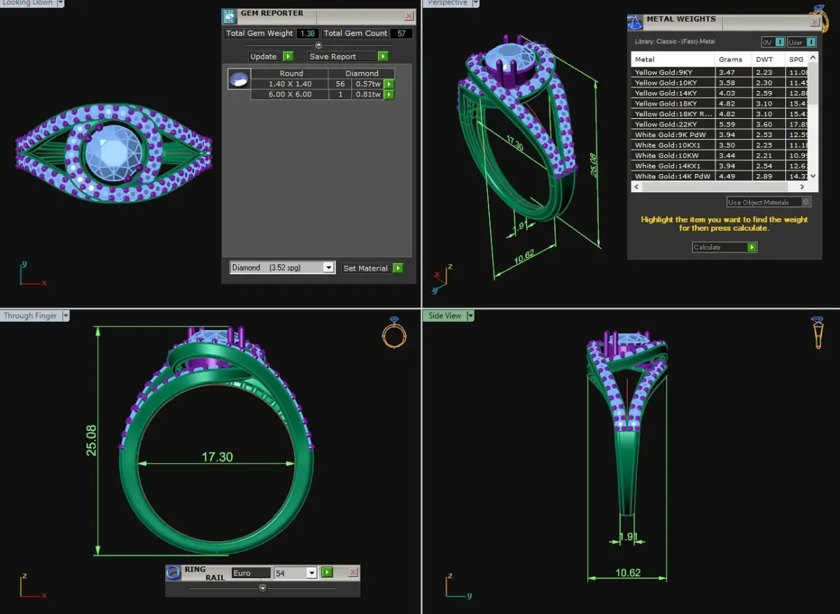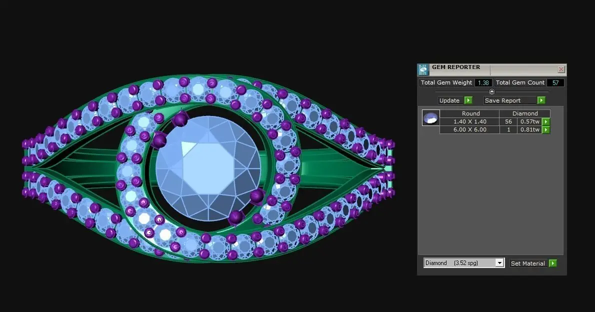 Gems: - Total gem count is 57 and total gem weight is 1.38. There are gems round 1.40 x 1.40 and 6.00 x 6.00. More info in the picture above.