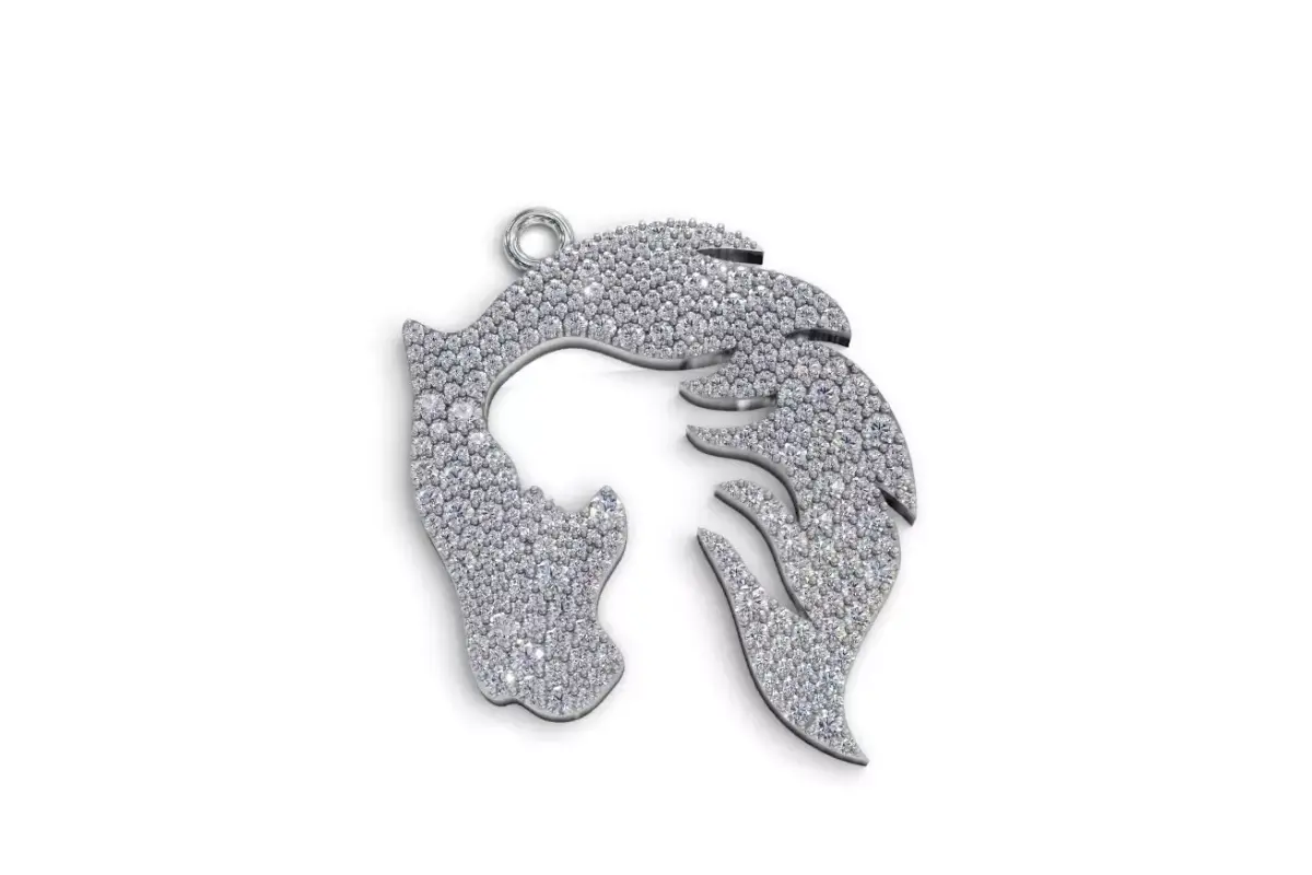 A beautiful 3D model of a lion head pendant that also shows the silhouette of a woman’s face. The design is covered with sparkling diamonds, perfect for jewelry design, 3D printing, or rendering projects.
