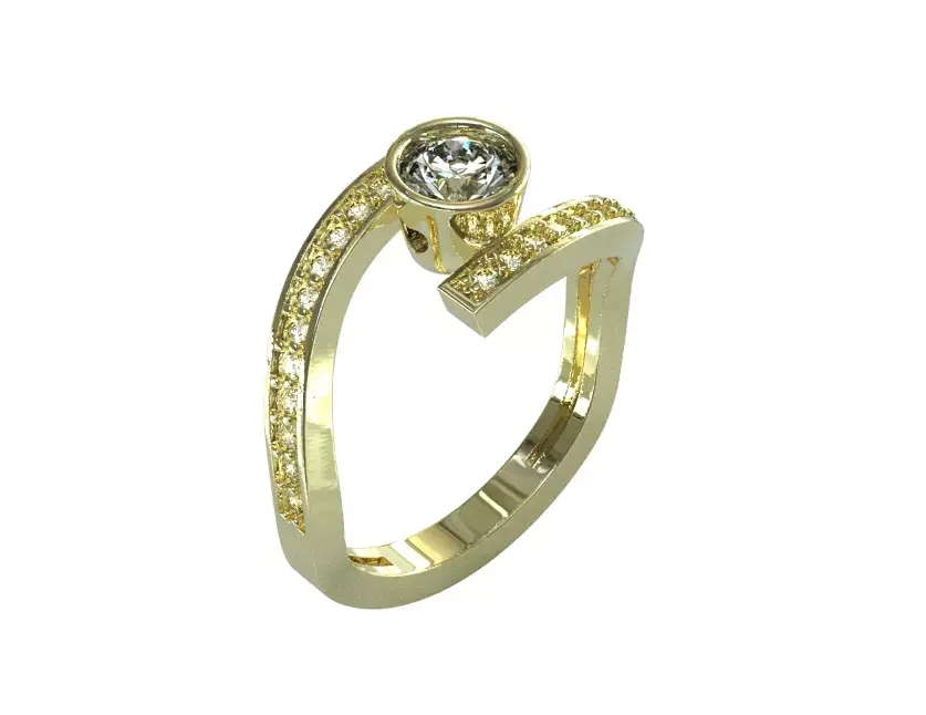 A modern gold ring design featuring a bezel-set round diamond (4.8 × 4.8 mm, 0.41 ct) as the centerpiece. The split shank is adorned with prong set stones, creating a stylish balance of elegance and sparkle. This 3D model is perfect for jewelry production, customization, or rendering projects.