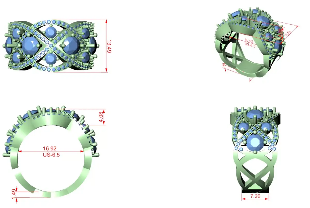 This bold multi-cluster designer ring CAD model is created for jewellery professionals seeking a luxurious and highly detailed statement ring suitable for premium collections. The design showcases multiple round stone clusters arranged across a wide top surface, enhanced with flowing crossover diamond lines that add movement and brilliance to the overall structure.