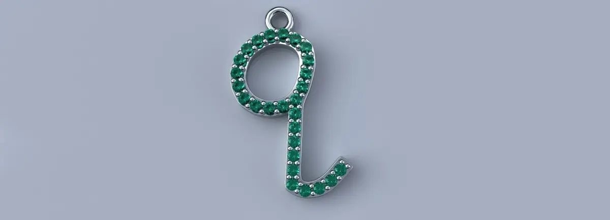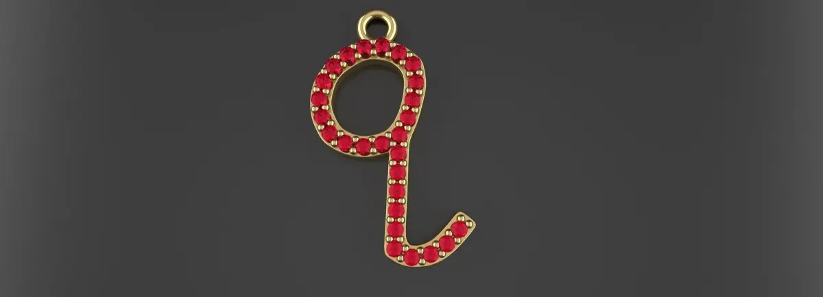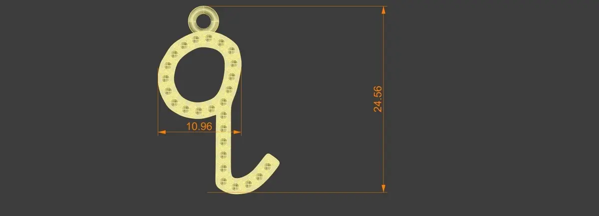 Diamond lower case q pendant model up for sale. Meets all jewelry manufacturing specifications. All other dimensions are in the last two pictures.