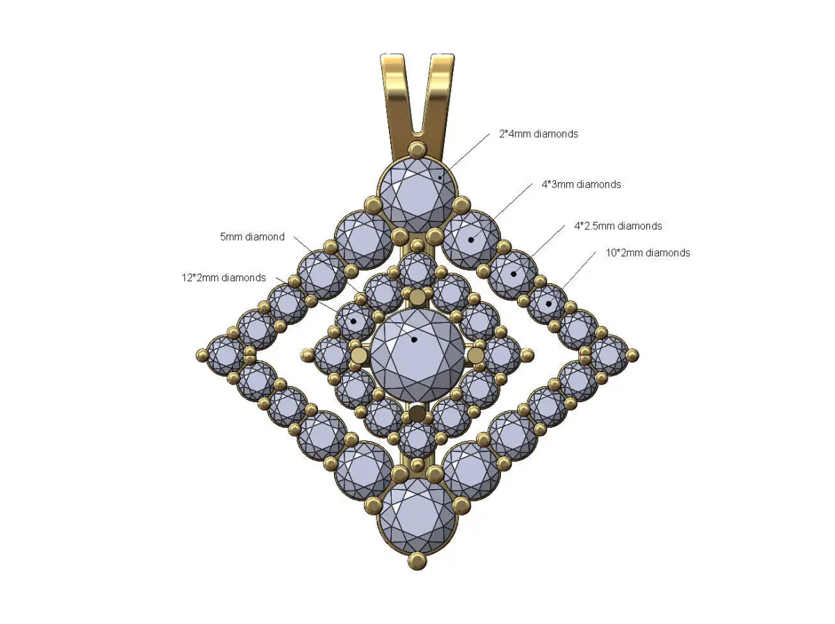 Size (23*23*5mm). 5mm diamond, 2*4mm diamonds, 4*3mm diamonds, 4*2.5mm diamonds, 24*2mm diamonds.