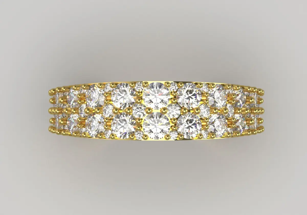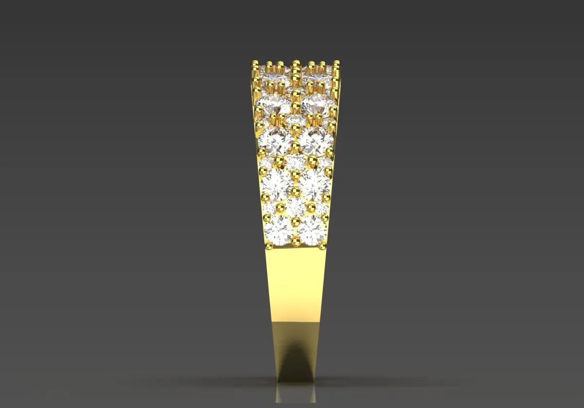 This ring is beautifully crafted from yellow gold, showcasing a luxurious and polished look. At the top, a series of sparkling diamond stones are carefully placed in a curved line, giving the ring a delicate look and a bit of contour. The stones are set closely together, creating a stunning effect that catches the light from different angles. Small prongs hold each stone firmly, enhancing the overall brilliance and adding a subtle touch to the design. This ring combines classic elegance with a modern twist, making it suitable for both special occasions and everyday wear. The warm color of the gold complements the sparkle of the stones, resulting in a stunning piece of jewelry.