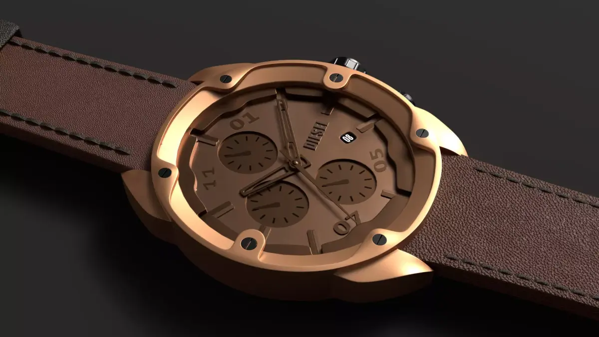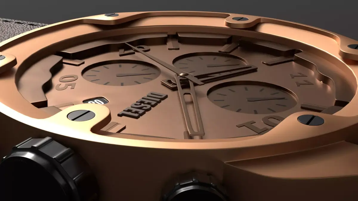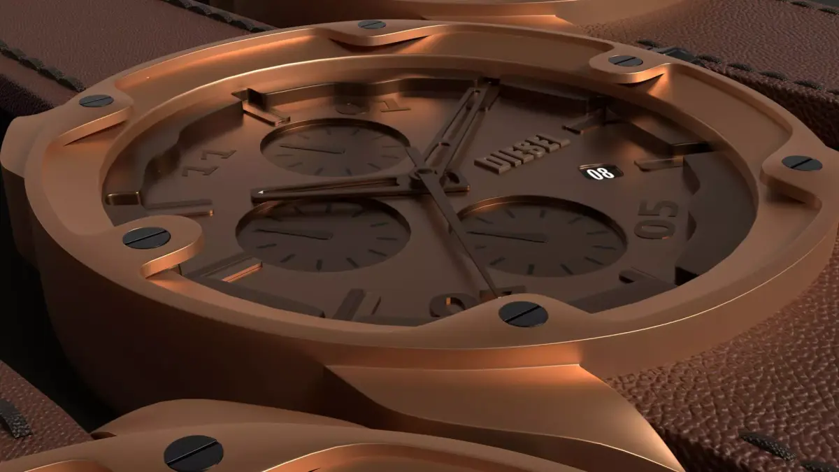 A Diesel-inspired chronograph watch modeled in Autodesk Maya and textured in Substance Painter. Featuring a rugged bronze body, engraved details, and realistic leather straps, this design highlights industrial aesthetics with multiple renders showcasing angles, lighting, and strap variations.