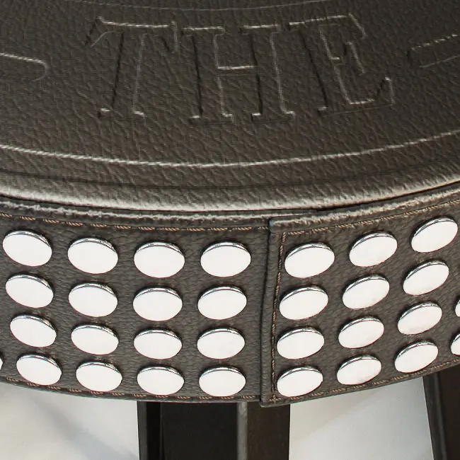 High Stool: seat in wood upholstered with polyurethane foam and black leather with or without studs.