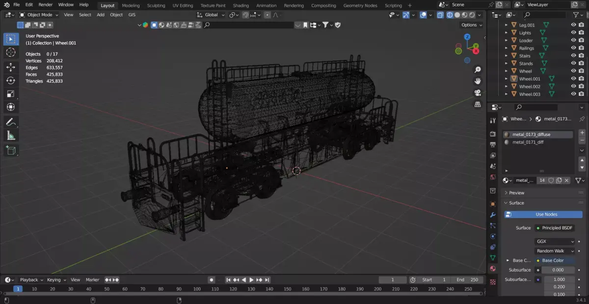 This 3D model represents a realistic diesel cargo train tanker bogie designed at millimeter scale to ensure accurate proportions and easy adjustment in any game engine or visualization project. This bogie is typically attached behind the engine and is used to carry diesel fuel, while passenger coaches are designed separately.