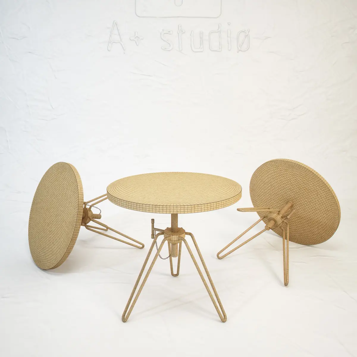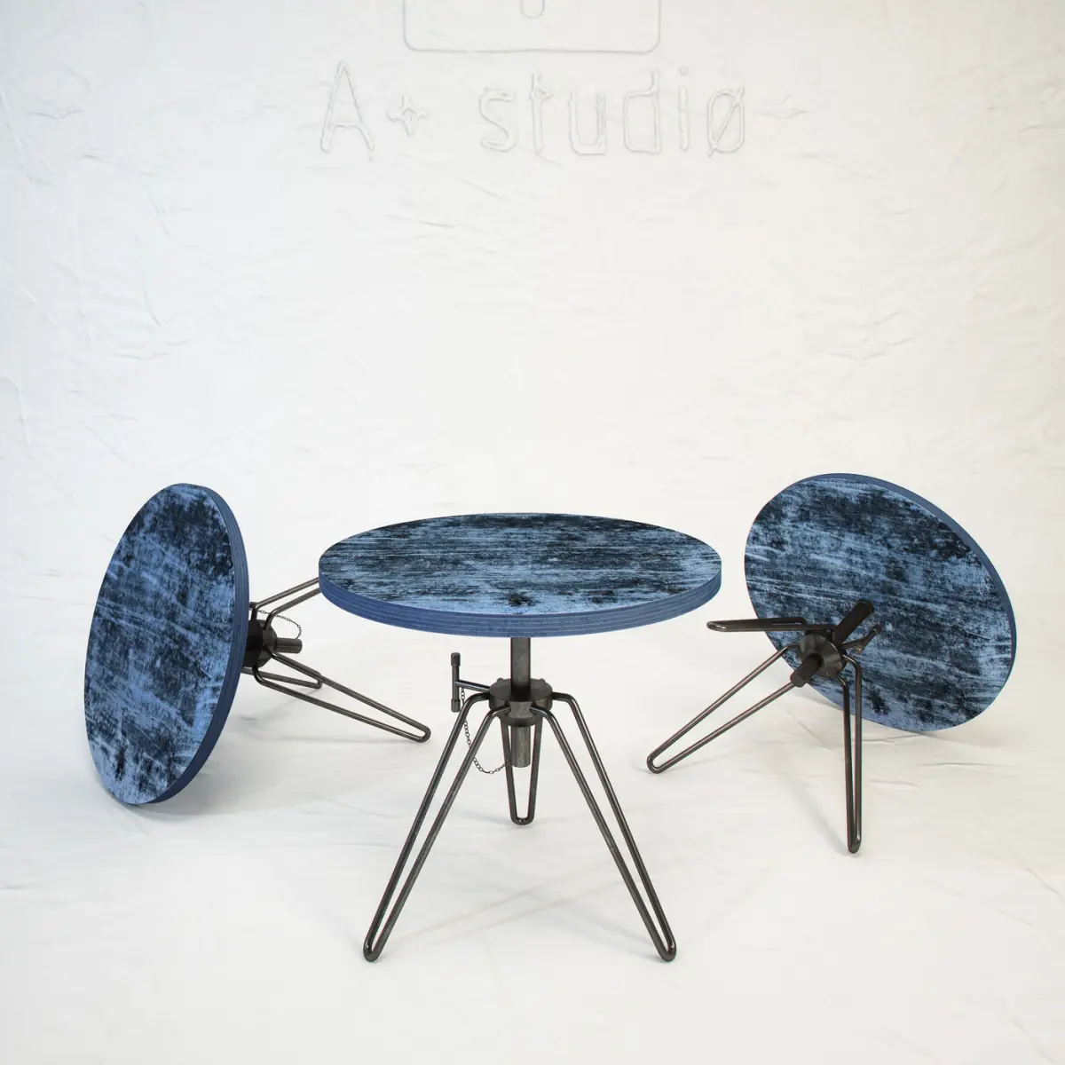Side table: top in MDF with aniline-dyed ash veneer. Base in steel.