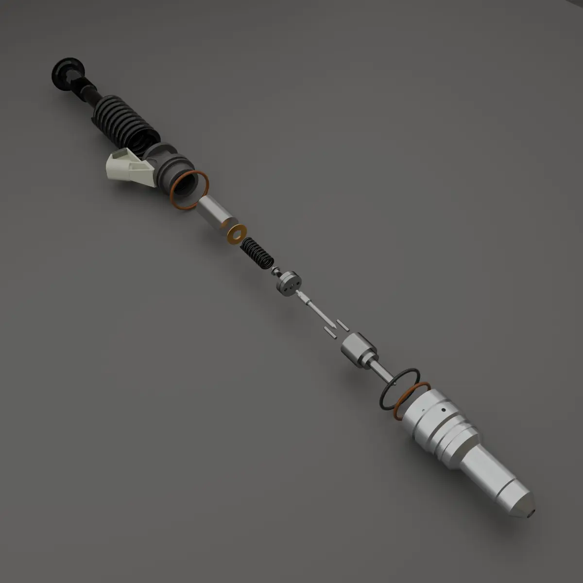 High-quality 3D model of a diesel injector unit, inspired by Bosch PDE-series designs. All internal and external components have been individually modeled and assembled, then laid out in an exploded view to showcase how each part fits together.