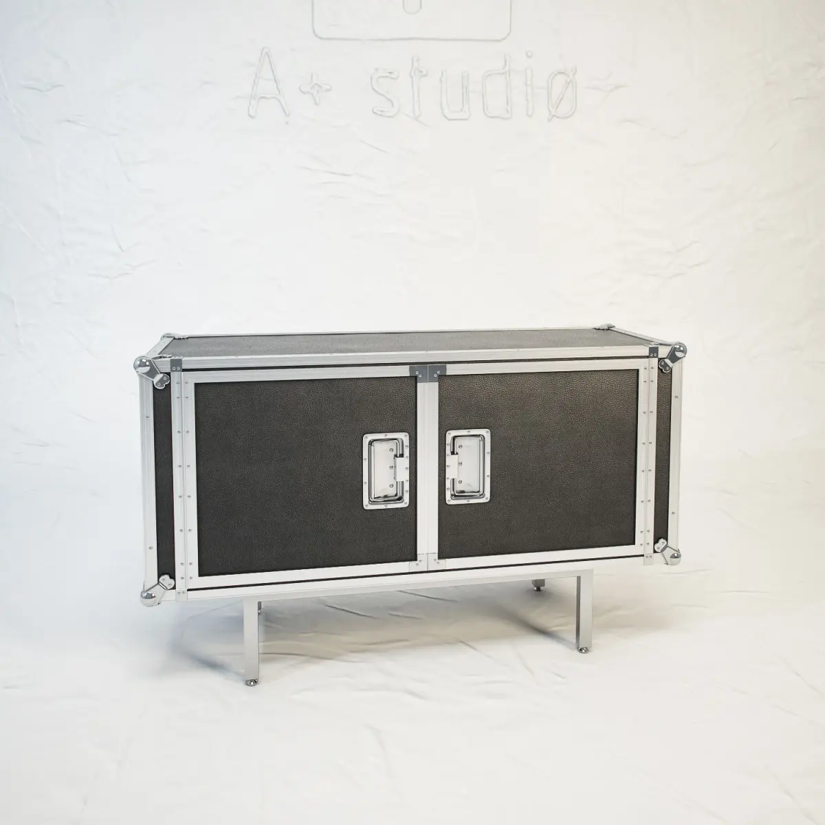A peculiar object is the cabinet inspired by the travel case used by musicians to carry their instruments on tour.