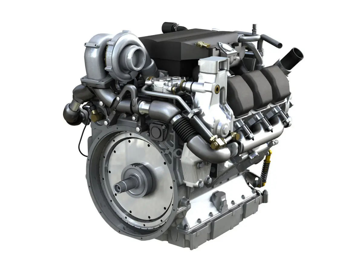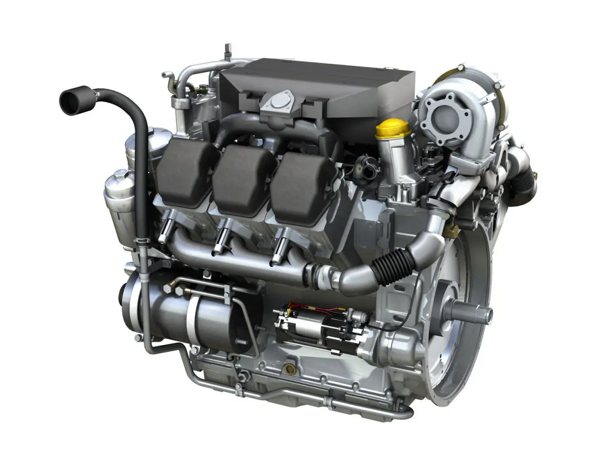 Diesel engine with 6 cylinders in Vee-type Konfiguration with inner workings parts in an schematic manner.