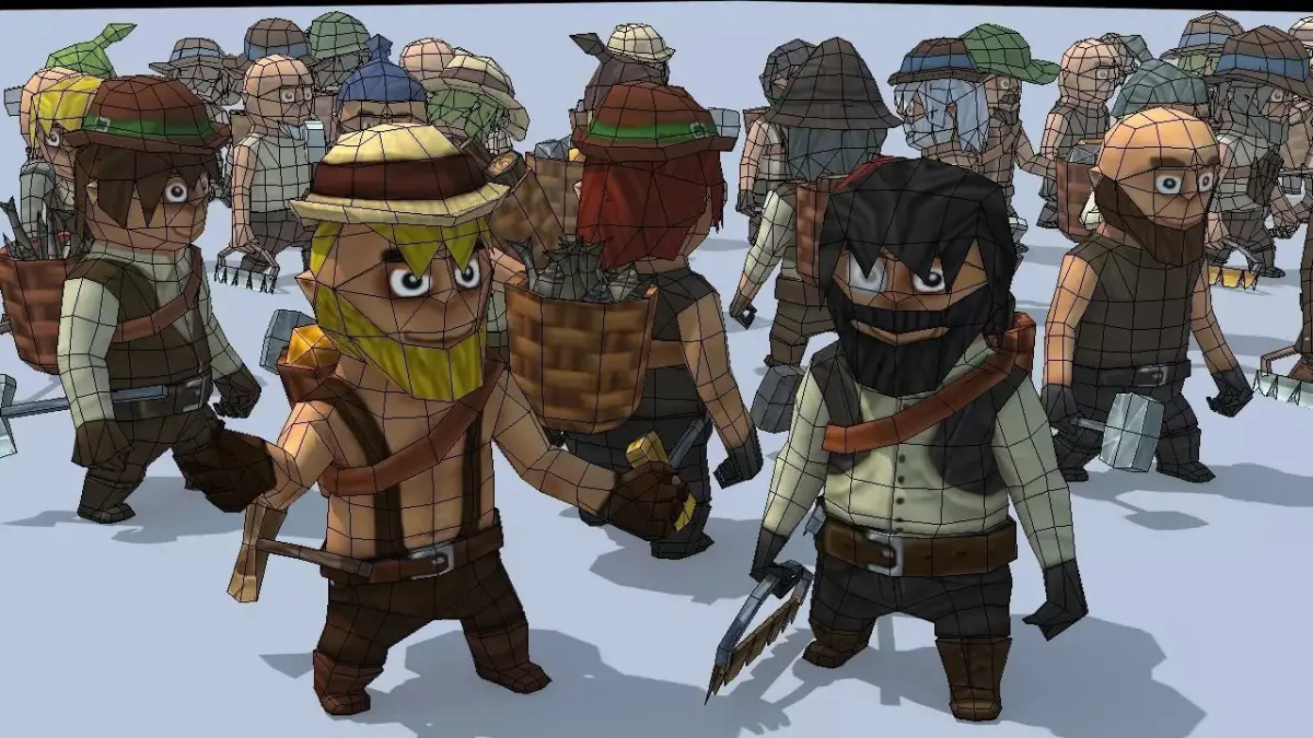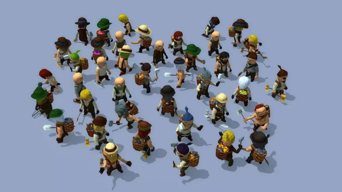 • 3 body • 934 Tris x 13 textures 512x512px• 7 tools x 3 textures 256x256px• 6 hats x 7 textures 256x128px• 8 hair x 10 textures 128x128px• 7 beards x 10 textures 128x128px• 6 resources (empty bag, fish, fruit1, fruit2, stone, wood) x 2 textures 512x512px• 6 Bags x 2 textures