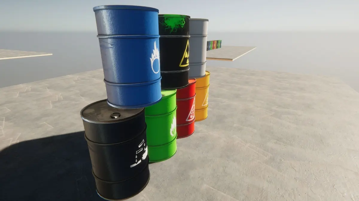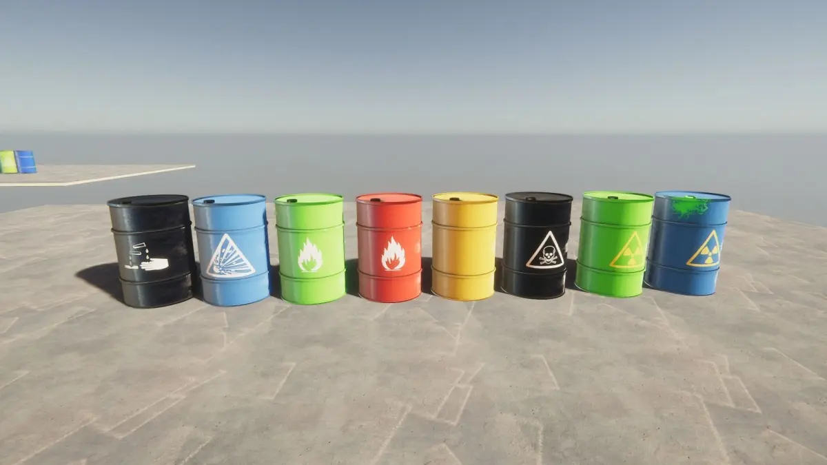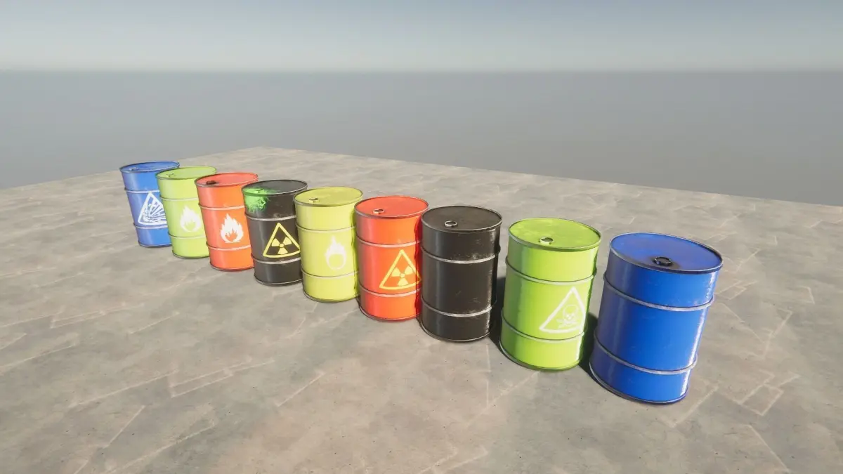 The composition includes: unpainted, red, yellow, green, blue and black barrels with or without special symbols.The barelHDRP.unitypackage file contains prefabricated materials ready for use in the UnityHDRP environment The barel.unitypackage file contains prefabricated materials ready for use in the Unity environmenttextures.zip file contains textures suitable for use in unity and unity High-Definition Render Pipeline environments