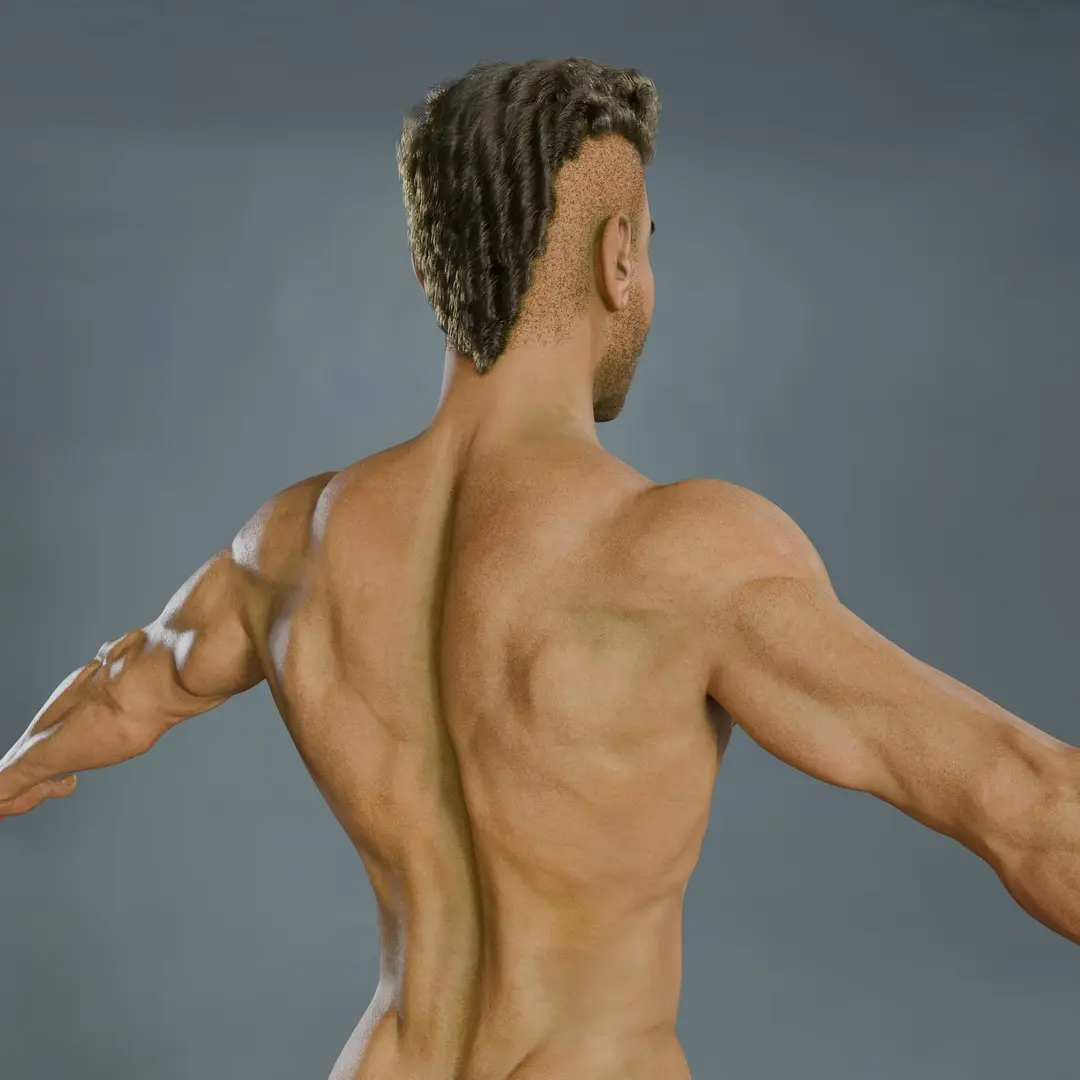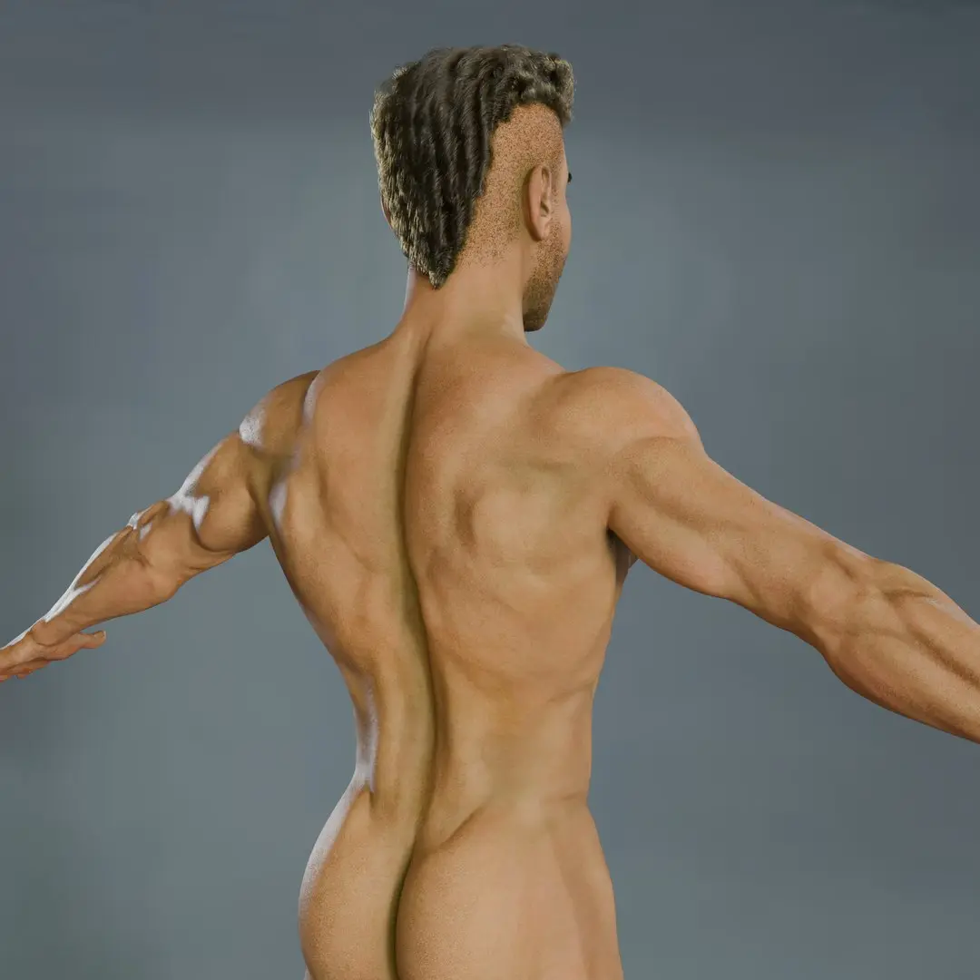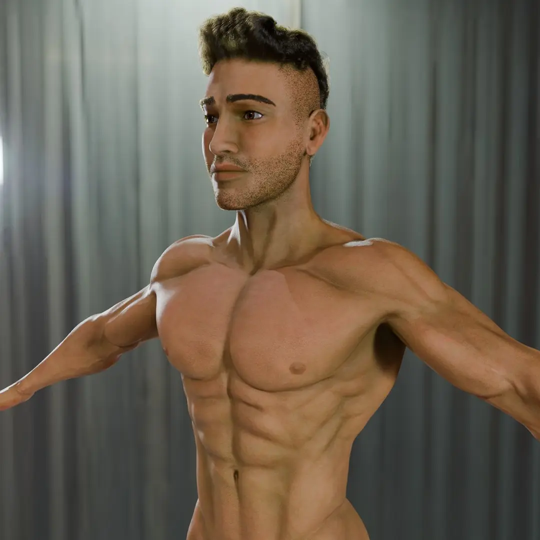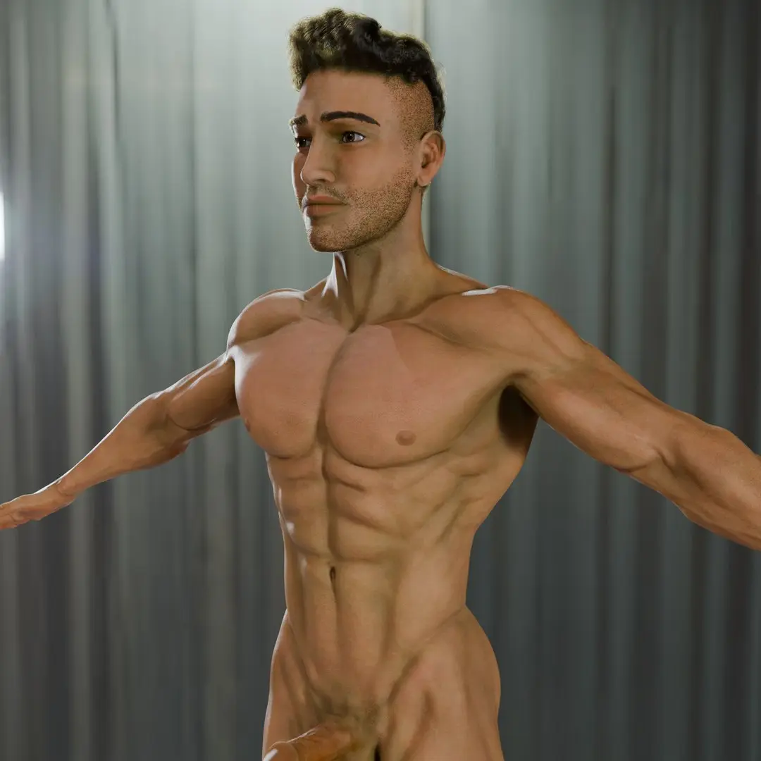 Digital Adonis is a high-quality, fully nude male 3D model created in Blender, featuring realistic PBR texturing and anatomical accuracy. The model includes detailed genitalia and a fully modeled inner mouth (teeth, gums, and tongue), making it ideal for high-end rendering, anatomical studies, and rigging workflows.