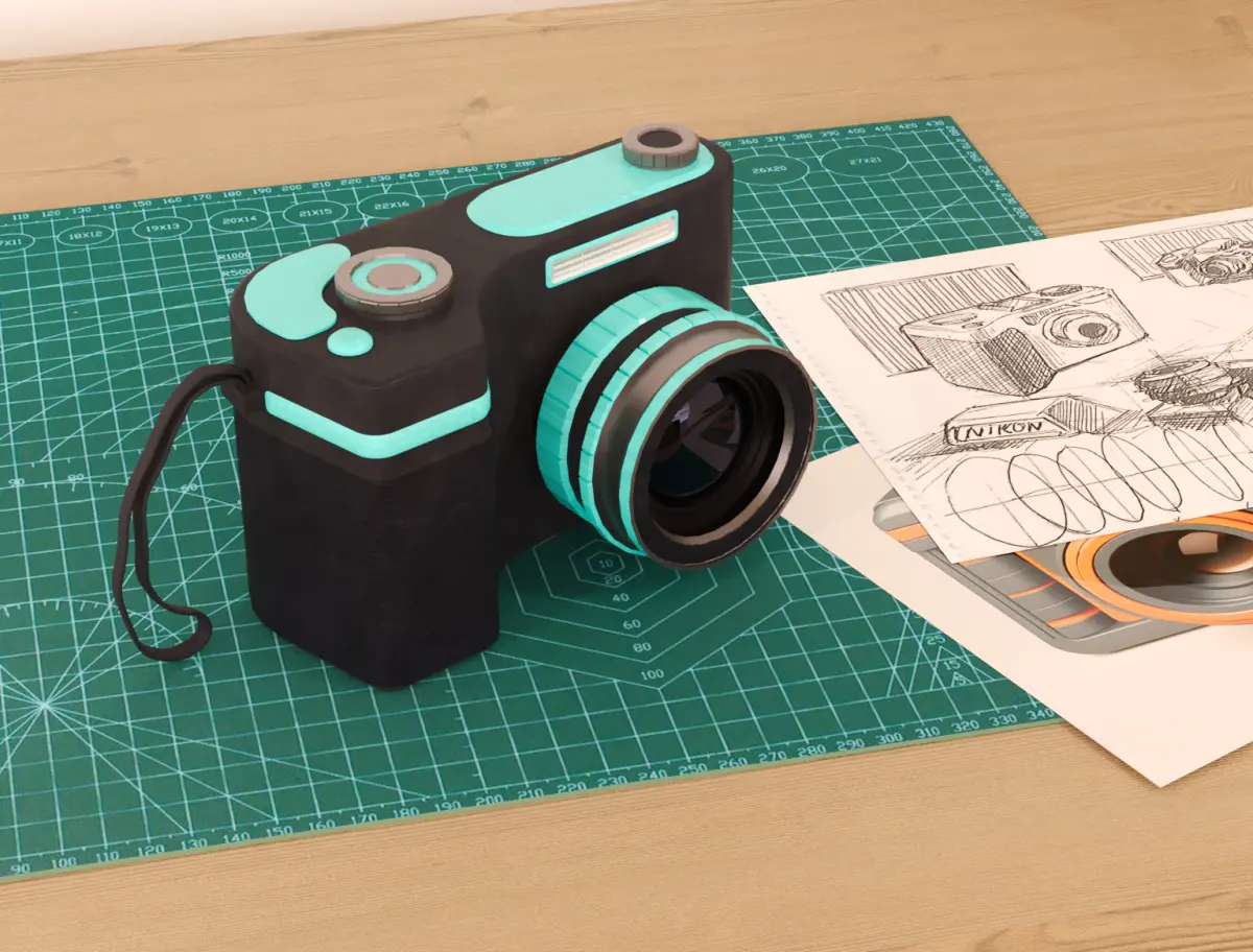 This sleek and modern 3D camera model features a compact yet stylish design. Its body is predominantly black, complemented by vibrant cyan accents that highlight key elements like the lens rings, buttons, and other functional details. The textured grip area ensures an ergonomic and professional appearance.Material: Black plastic rough, colored metal brushed, glass, iron textureIdeal for use in visualizations, animations, or as a prototype design, this model combines aesthetic appeal with functional realism. Whether you're building a product showcase or creating a tech-inspired scene, this camera model will stand out as a premium asset.