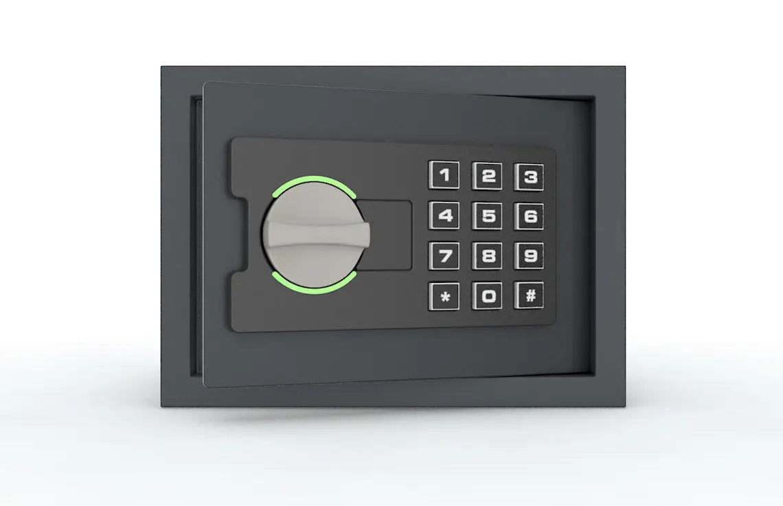 A concept wall safe with a digital combination keypad used for mounting within a wall to keep valuables safe, working door.