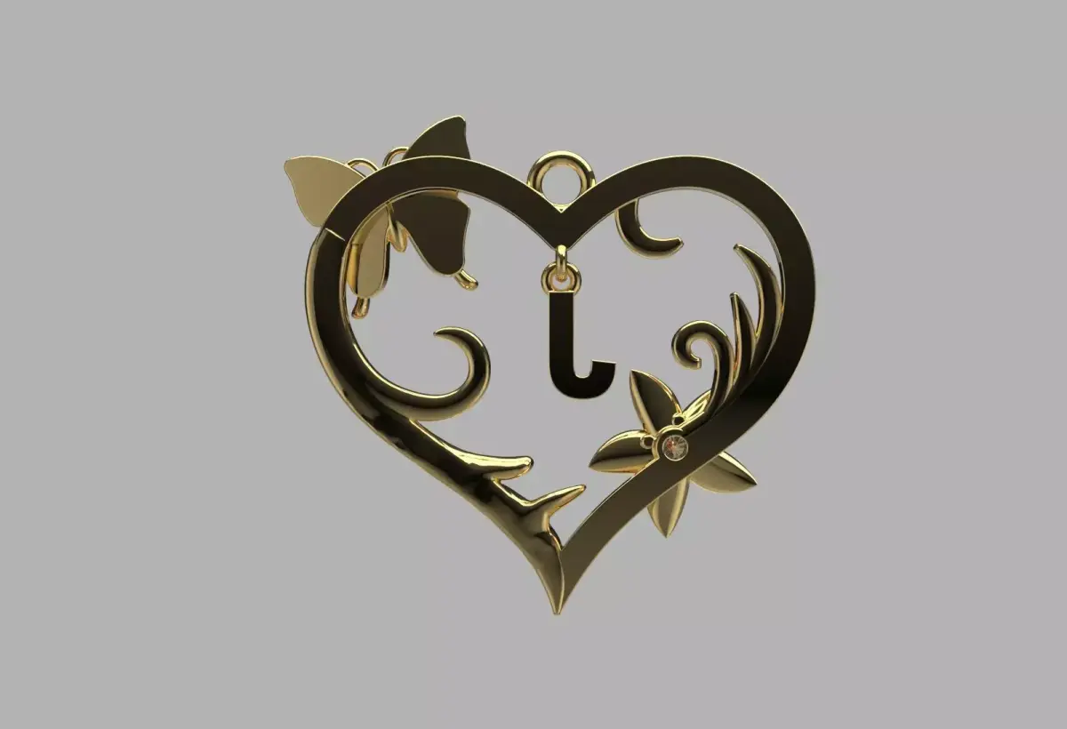 Dije de un corazon con una mariposa totalmente diseñada para impresion y producción tanto en oro como en plata, la letra se pude cambiar a la que usted quira, escribame por ese medio para el cambio