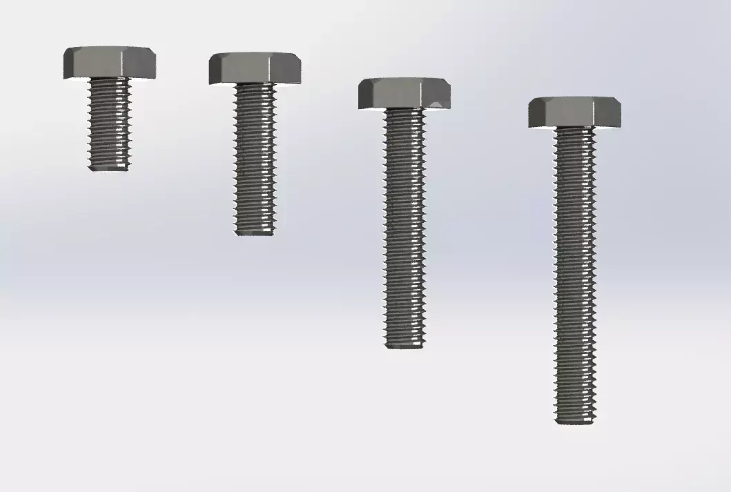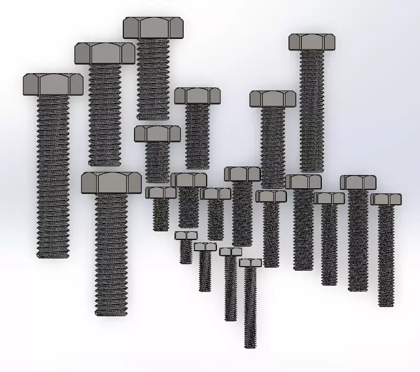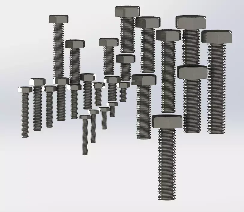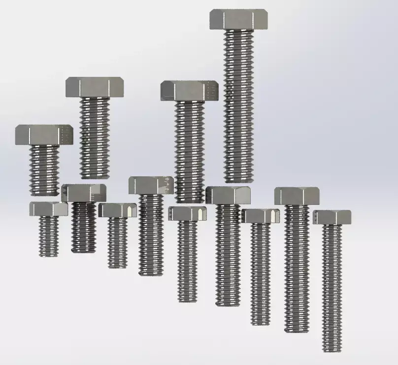 High-Quality Mechanical Bolt LibraryThis pack contains 26 different variations of DIN 933 standard hexagon head bolts. All threads are modeled with real geometry (not textures), making them perfect for close-up engineering renders and high-detail industrial visualizations.