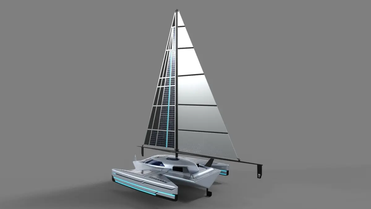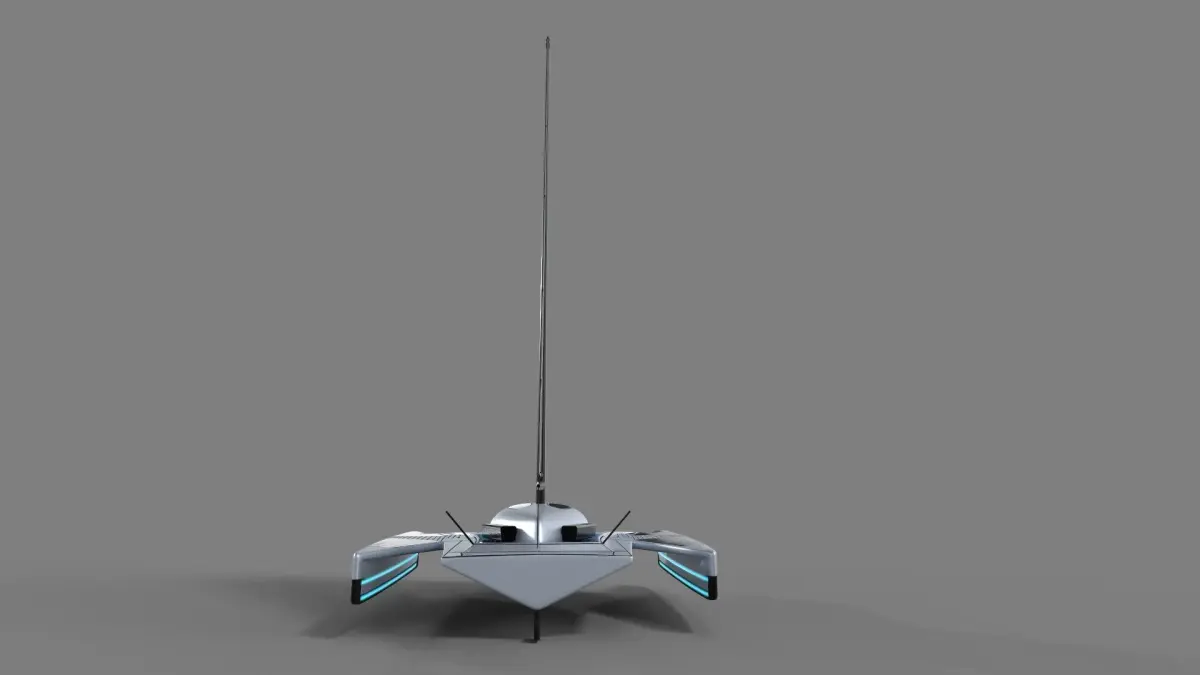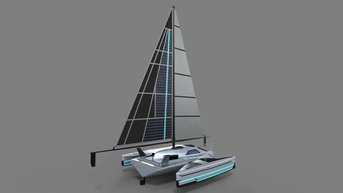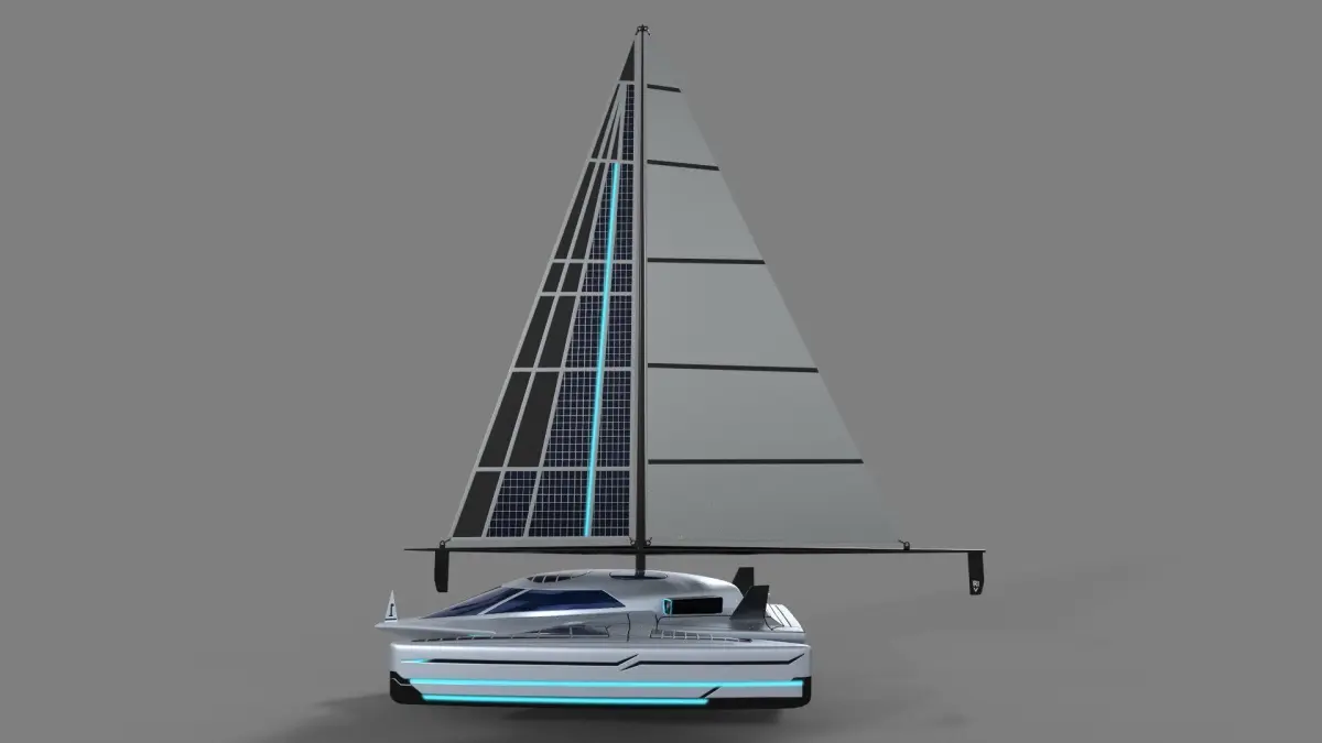 1 A futuristic sailing dinghy with a sleek and angular design, featuring a metallic silver hull and neon blue accents, equipped with advanced solar panels integrated into the sail for eco-friendly propulsion, a transparent cockpit dome for panoramic views, and retractable hydrofoils for smooth gliding over the water.