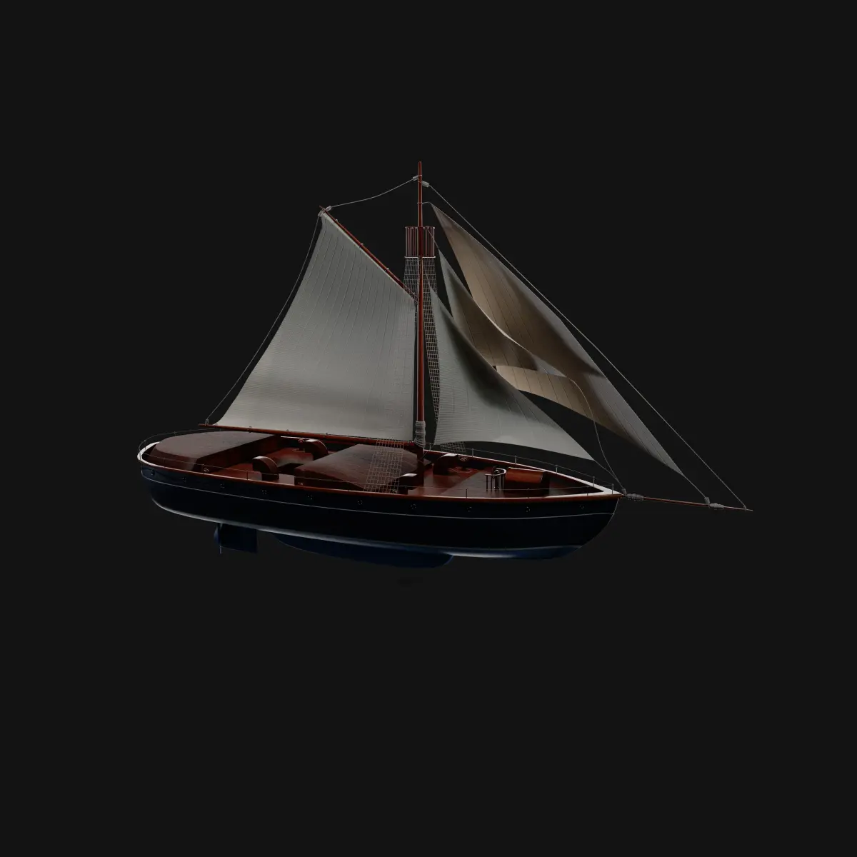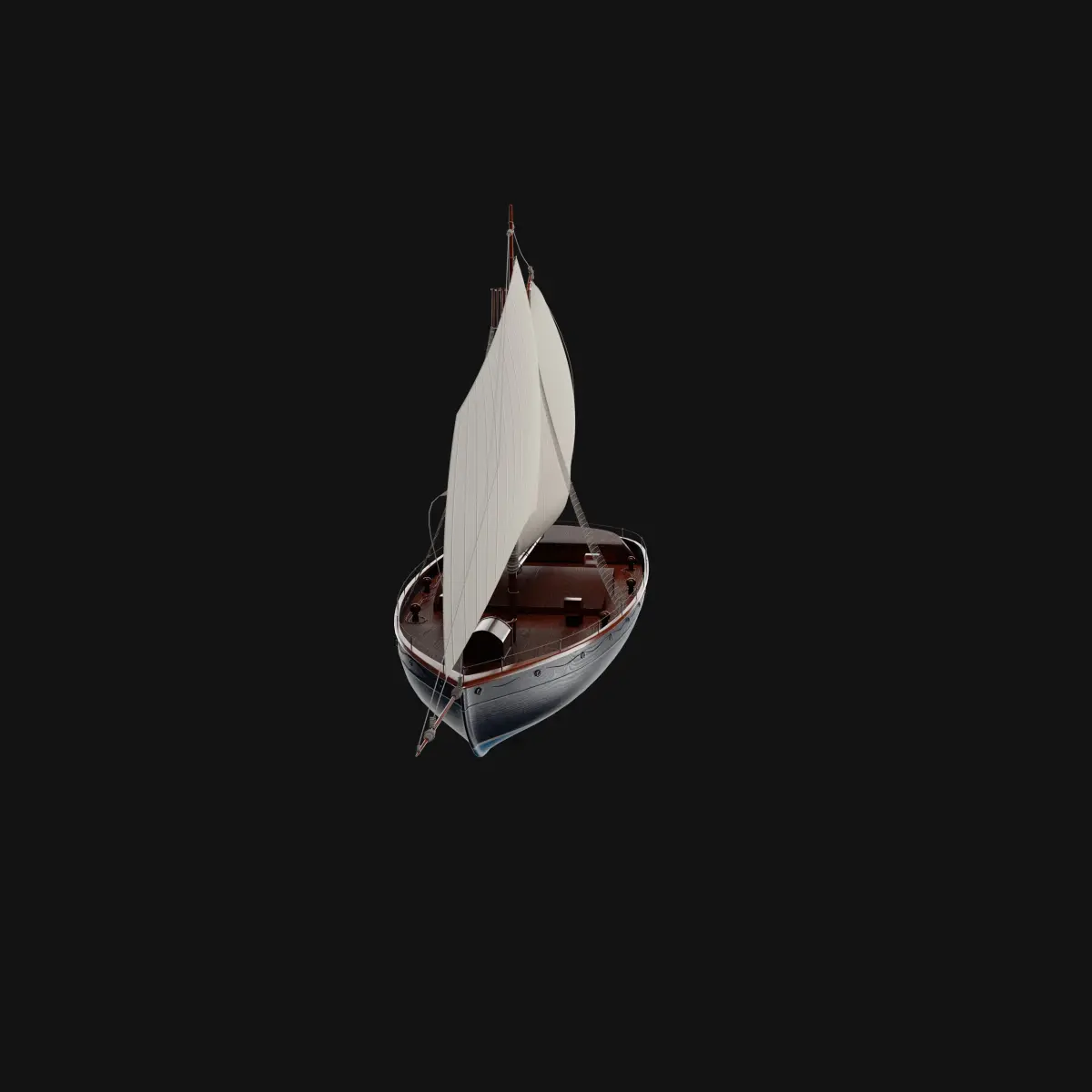 A historical sailing dinghy with a sleek and curved design, featuring a dark navy blue hull and a white mast standing tall against the clear blue sky, with intricate rope rigging adding to its authenticity.