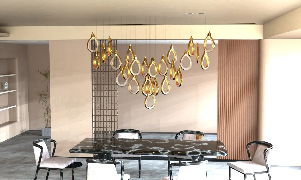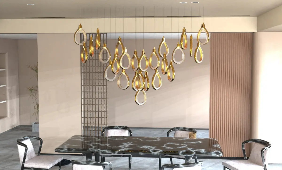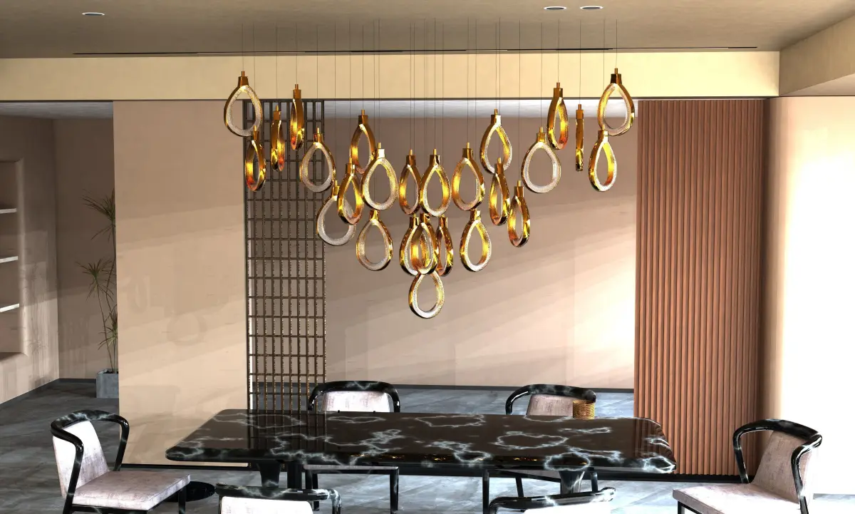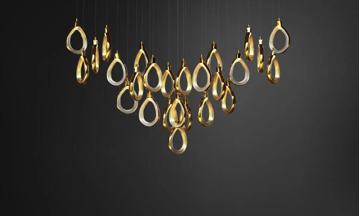 Elevate your interiors with this exquisite teardrop-inspired chandelier. Featuring a cluster of delicately sculpted golden teardrops suspended at varying heights, this design exudes sophistication and warmth. The soft glow emanating from within each teardrop enhances its visual allure, making it a perfect choice for upscale environments.