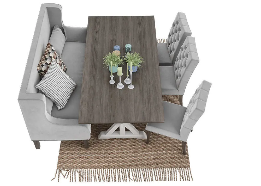 High quality 3d models of a complete classic dining setup with a dining-table, chairs, dining sofa, carpet, plants, candlelights, pillows and plants all with all maps included.