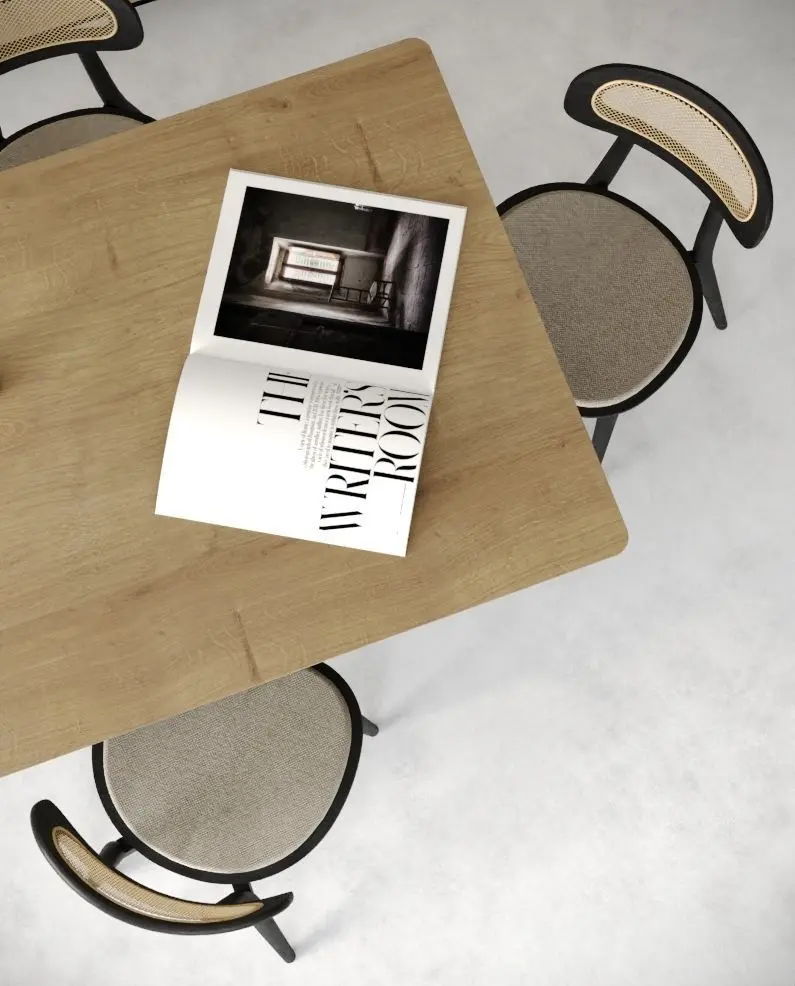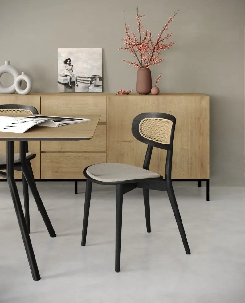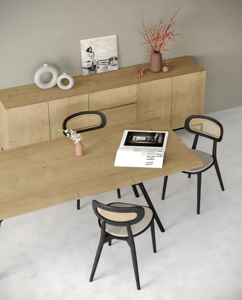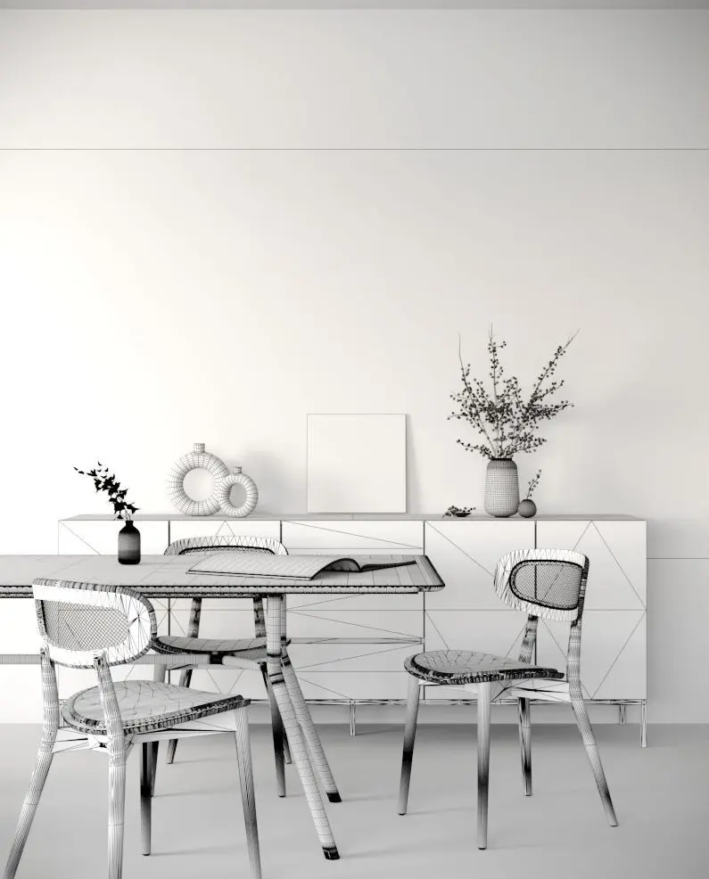 This scene is about a dining room set with dining table, chairs and cabinet with related decoration objects.
