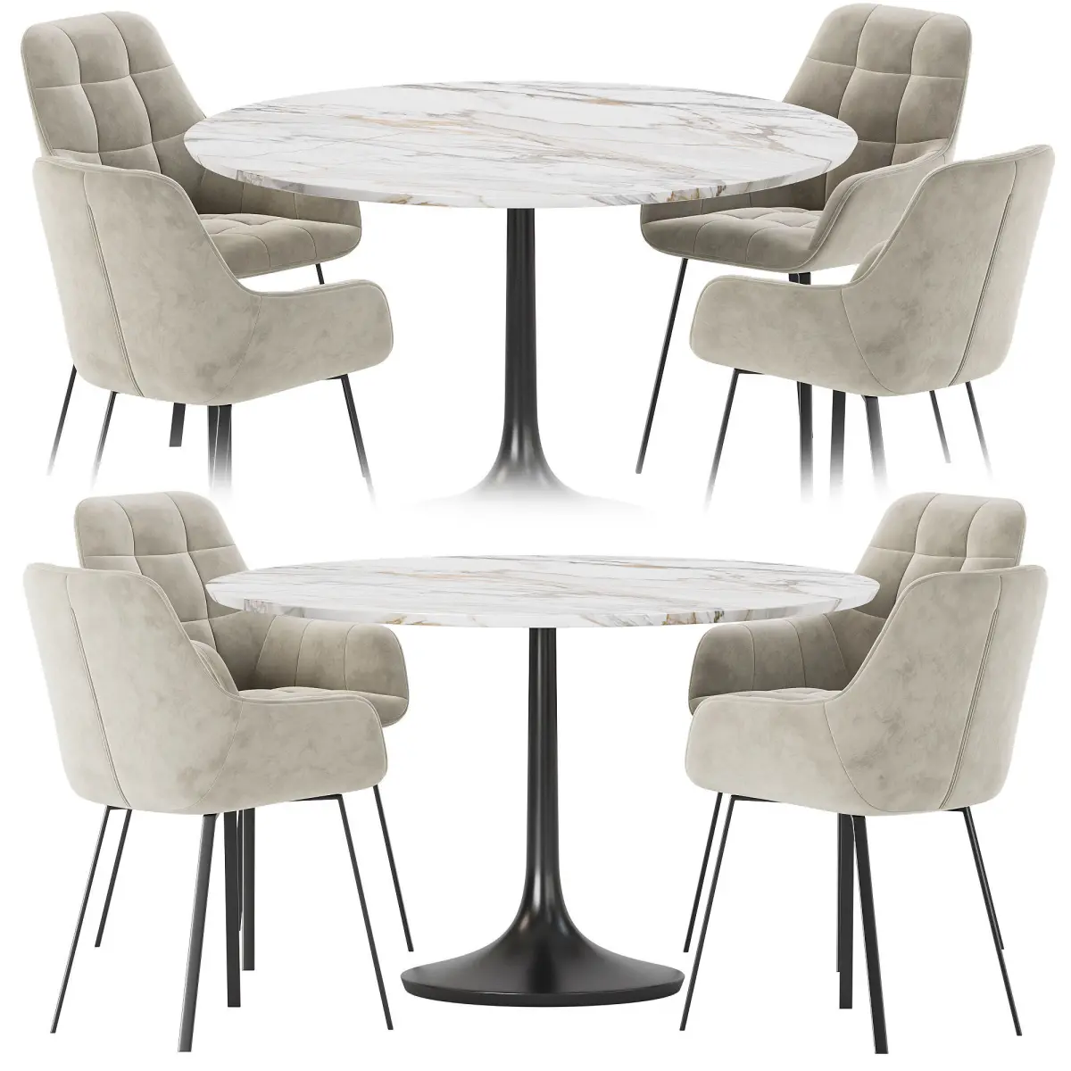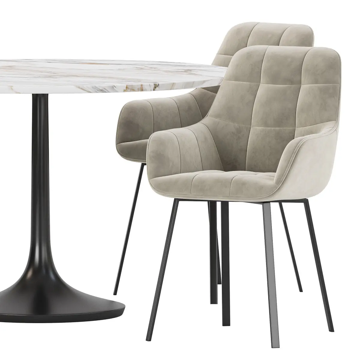Link: Chair: https://spb.mebhome.ru/shop/kuhni/stulya/woodville/na_metallokarkase/Stul_Woodville_Kelmi_mikrovelyur_svetlo_bezhevij__chernij_glyanetc_623883_item/Table: https://www.crateandbarrel.com/nero-white-marble-dining-table-with-matte-black-base/f95038