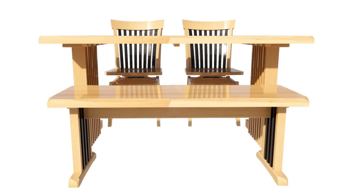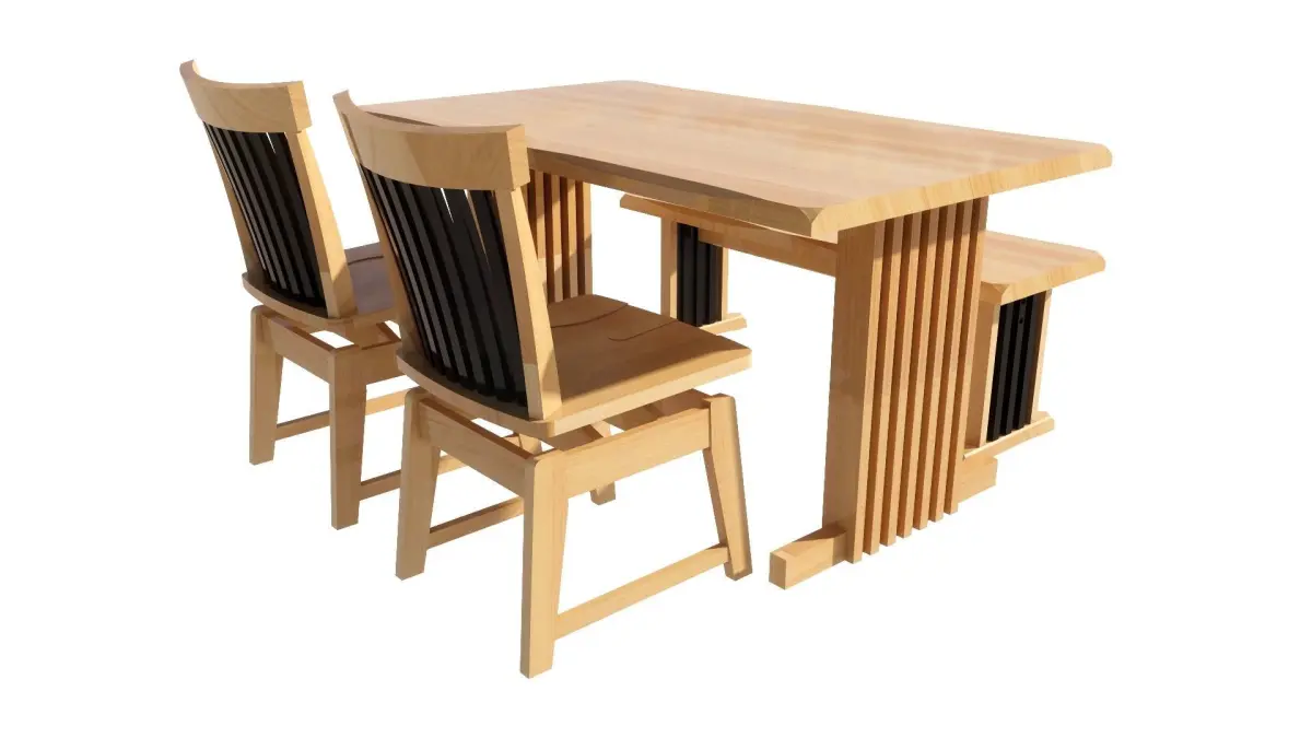 There are 3 models of a 4-seat dining set: 1. Table, width 85, length 145 cm., equal to 1 piece. 2. Chairs, equal to 2 pieces. 3. Bench, equal to 1 piece. It will be designed in a wood color. Dark-light colors can Place it in the corner of the kitchen, living room, and front room.Restaurant, coffee shop, dessert shop