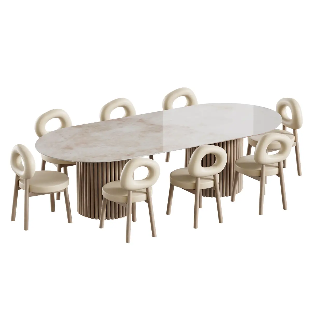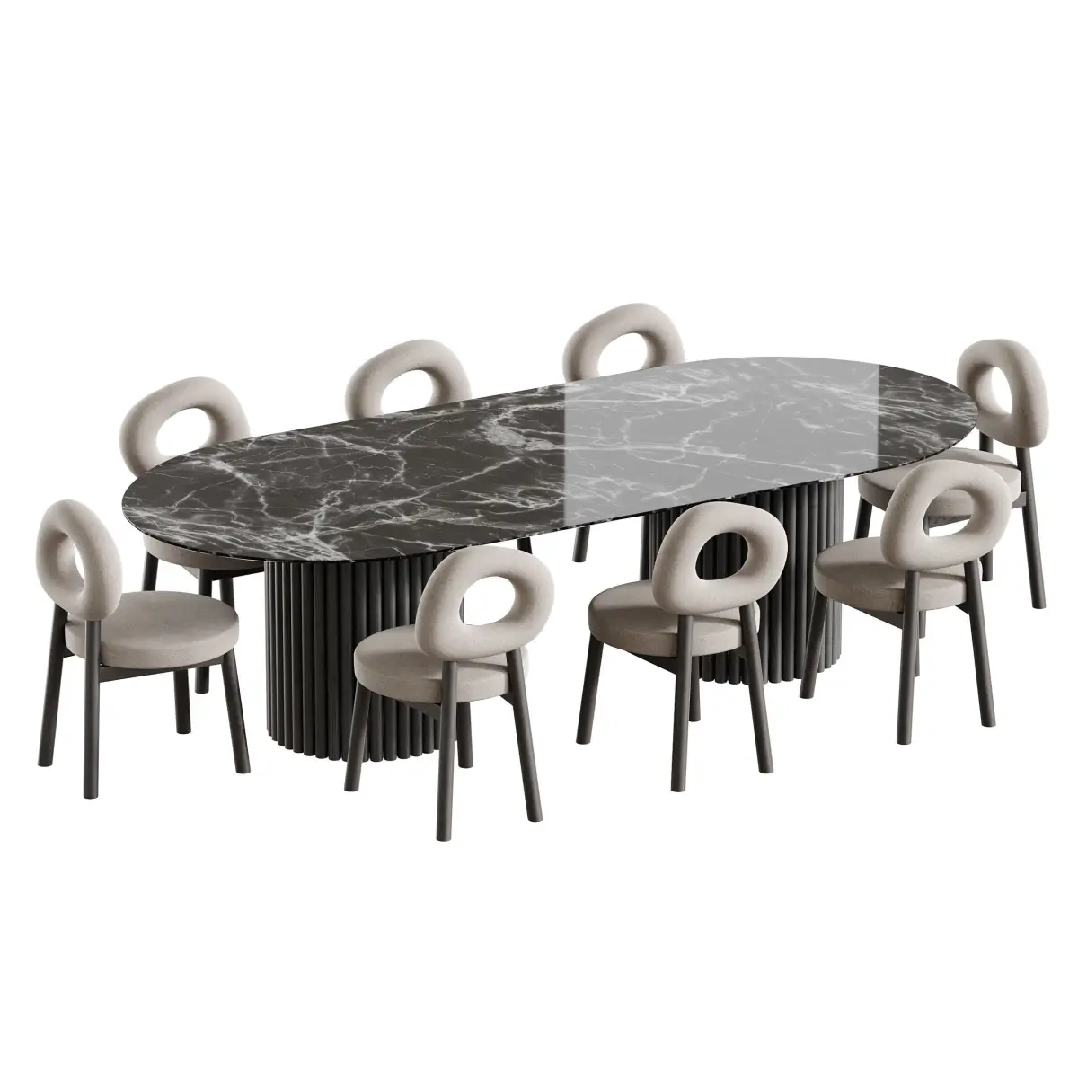Tags: dining table, marble top, modern furniture, elegant dining, oval table, 3D model, luxury table, corona renderer, upholstered chair, boucle chair, round backrest, furniture set, 3ds Max model, FBX OBJ, high-end dining, interior design, contemporary table, visualization asset, minimal design, architectural furniture, dining set, beige marble, black marble, white marble, chair and table set, product design