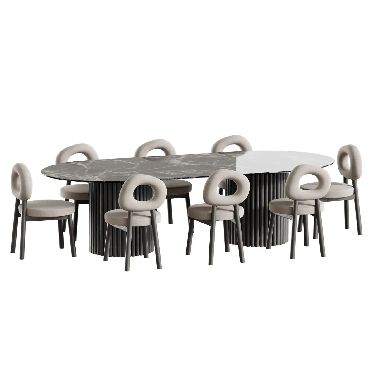 Name: Dining table BREMENType: modelFormat: 3Ds Max 2016Export: FBX, OBJRender: Corona Renderer 10Polys: 97920Verts: 51172Units: MillimetersDimension: 3344.64 x 1947.63 x 1008.04Description:A modern and luxurious dining table with an elongated oval marble top and vertical slat-style cylindrical bases. The table is paired with eight sculptural chairs featuring rounded backrests and upholstered seats. Designed for upscale interiors, the BREMEN set combines visual softness with material richness. The tabletop comes in various marble finishes including light beige, white veined, and black marble. Perfect for dining rooms seeking elegance with a contemporary touch.