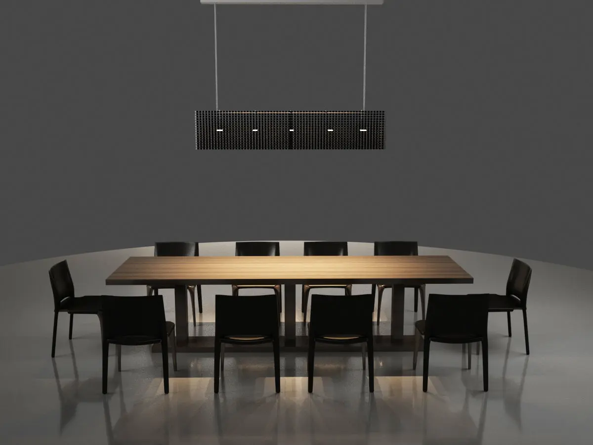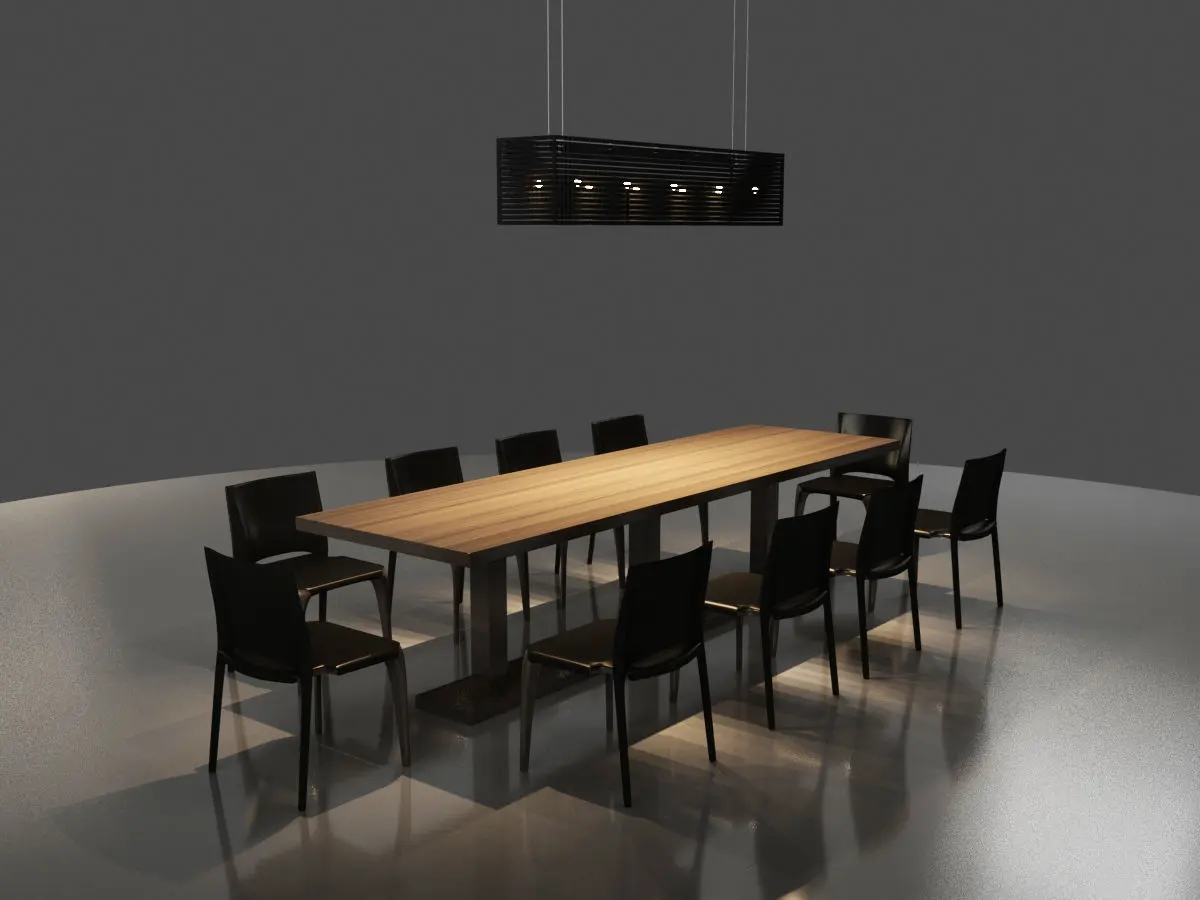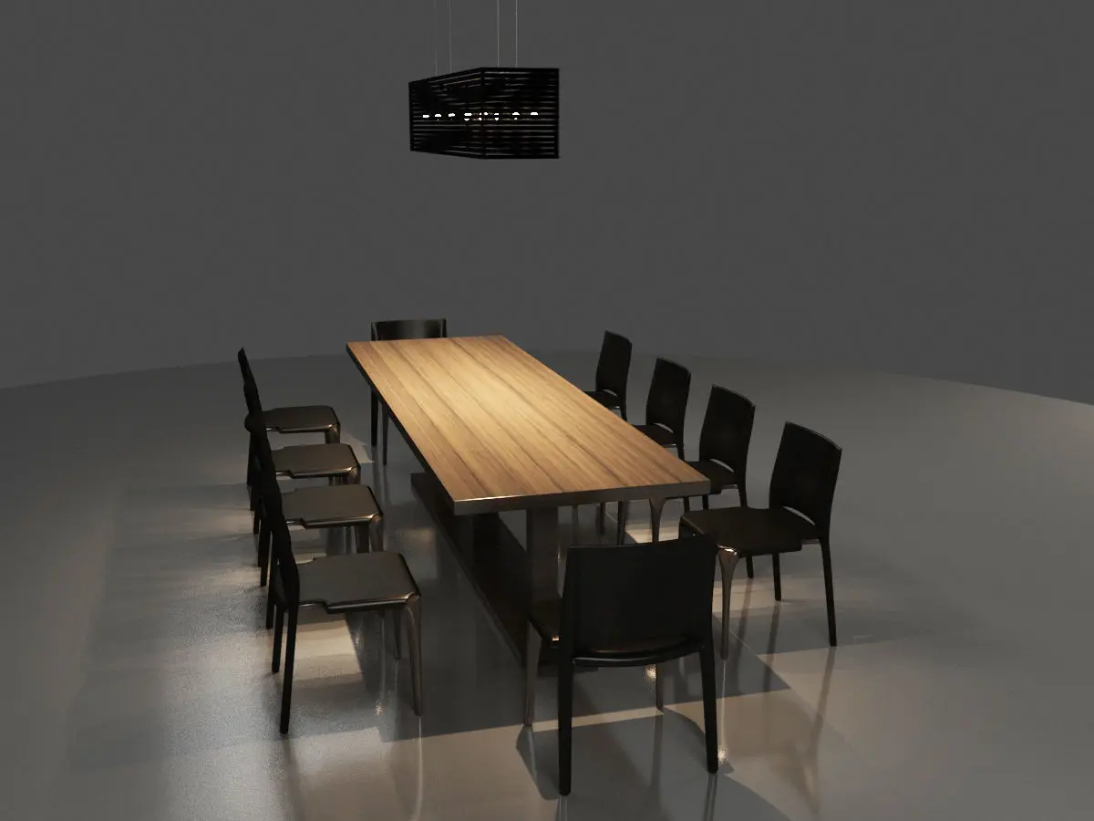 Table:The table is a regtangle table. It is designed for 10 people also it can be modified for your designed. It has three wooden legs under the middle of the table top. table dimentions:( approximate measurement )plan size : 90 x 310 cmtotal height : 76 cmChair:Wooden Chair covered with black leather. Modern style. Seating and backrest covered in black leather. Front legs are wooden, back legs are covered with black leather.Details close in appearance is of high quality. Texture can be changed.It can be made in different colors and textures.UVW map can be interfered with.the drawing steps of the model are protected. Changes can be made if requested.It is instructive.chair dimentions:( approximate measurement )plan size : 50 x 50 cmsetting height : 43,5 cmtotal height : 78 cmLamp: Black painted metal lamp.lamp dimentions:( approximate measurement )plan size : 30 x 163cmtotal height : 125 cm