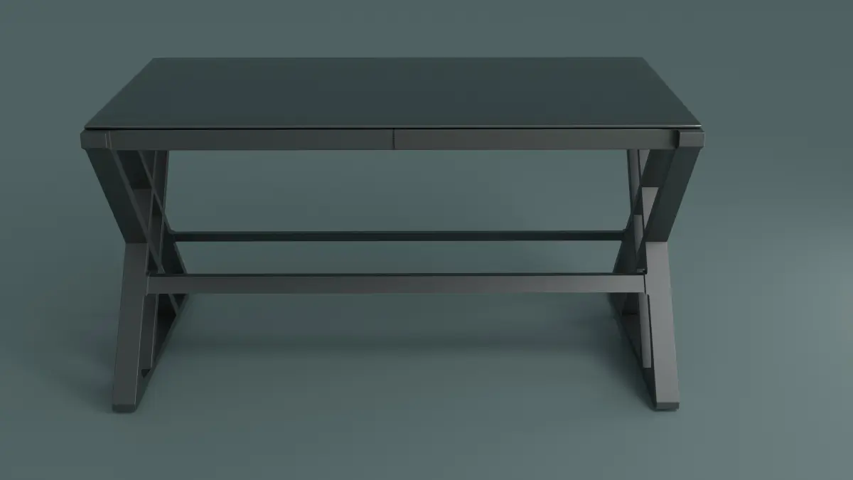 . A high-quality 3D model of a modern Joker-themed multipurpose table, blending sleek minimalism with a subtle, edgy character twist. Ideal for use in interior visualization, environments, or animated home/office scenes. Sculpted metallic legs in a light graphite/silver (lead-like) finish with a soft brushed texture. The design subtly echoes the iconic diamond motifs and chaotic elegance inspired by the Joker's aesthetic, but without overt symbols—perfectly modern and versatile.