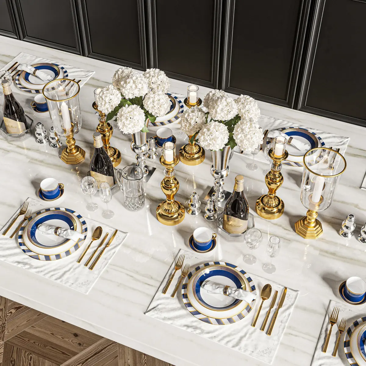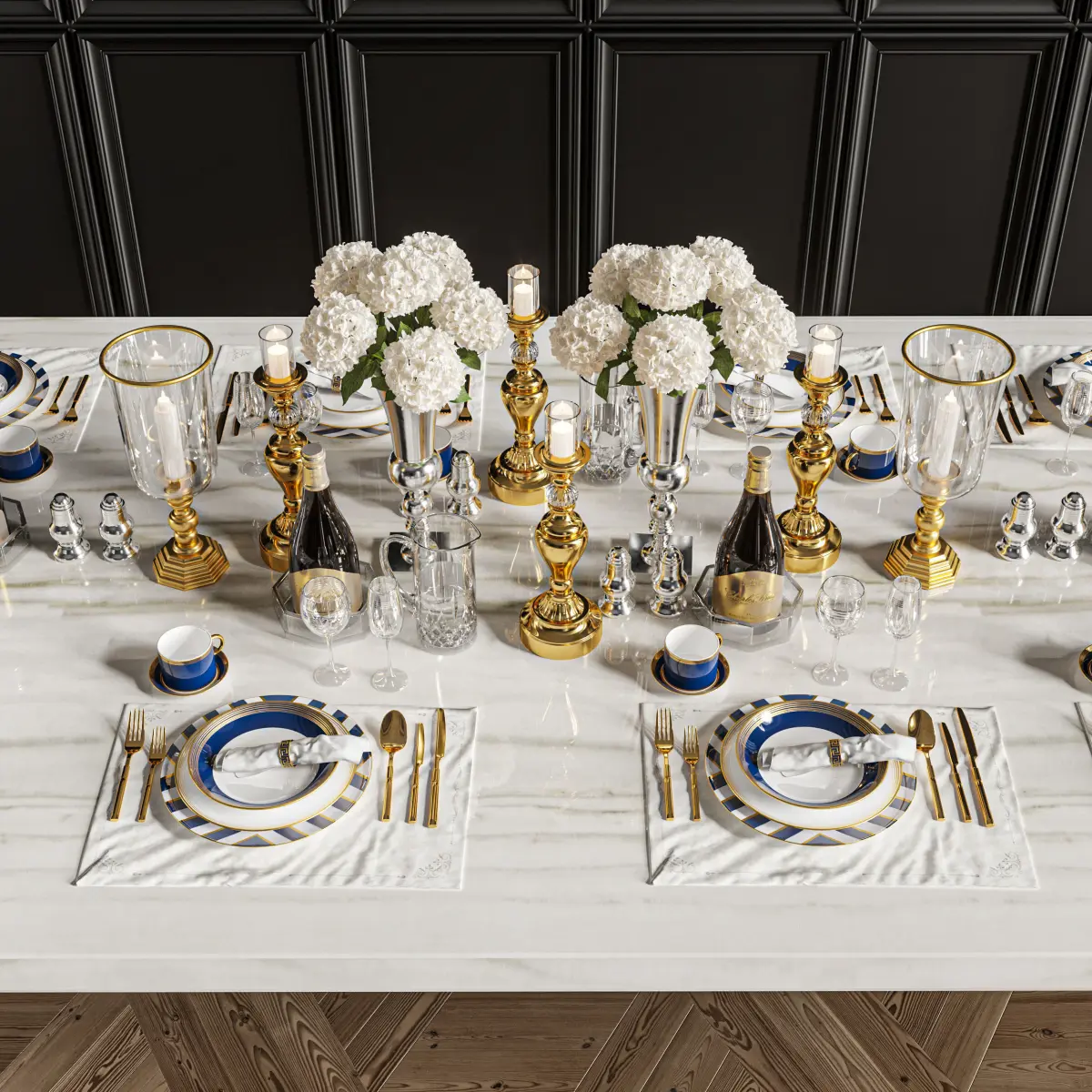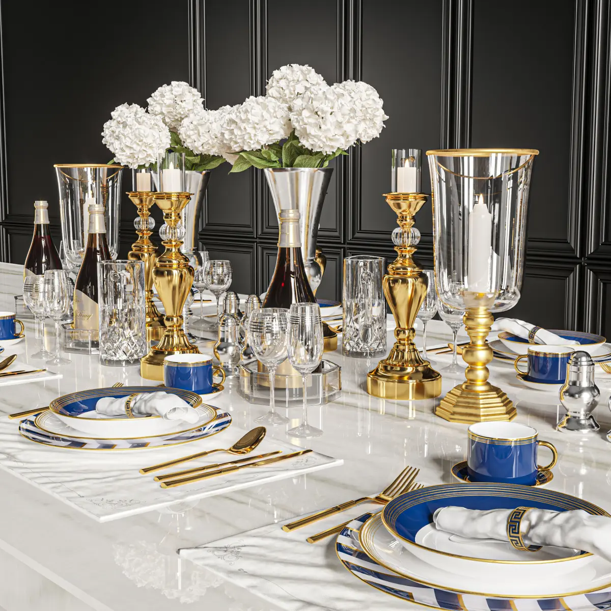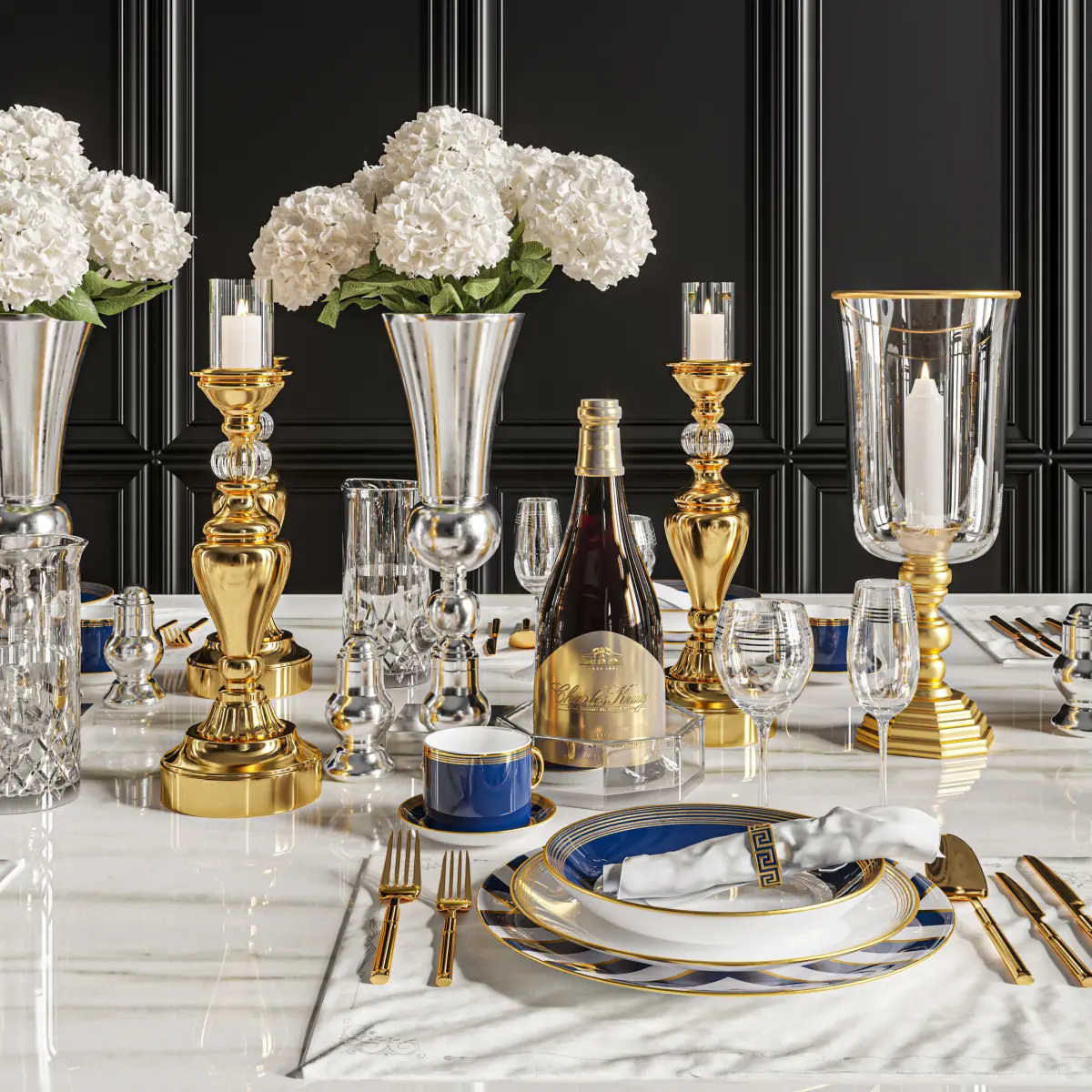 vase, gold, decor, decoration, candle, dinner, eat, dish, fork, spoon, glass, napkin, glass, wine, hydrangea, jug, water, blue, elegant, luxury, gold, brass, salt, pepper,