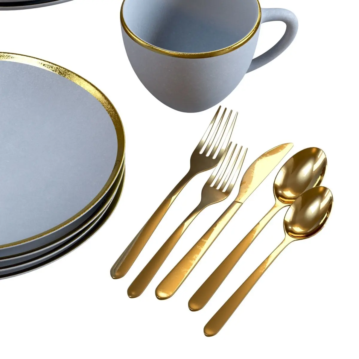 Originals: https://www.crateandbarrel.com/addison-grey-16-piece-gold-rim-dinnerware-set/s534616https://www.crateandbarrel.com/jasper-gold-20-piece-flatware-set/s200996