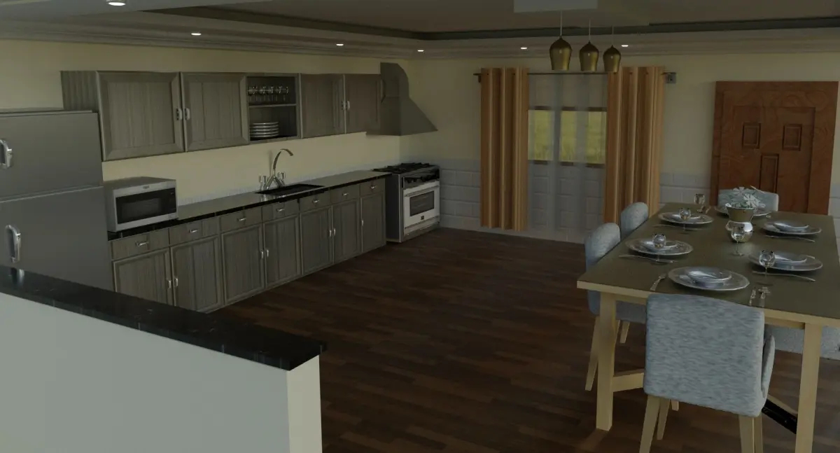 dinning room with all required detailsdinning table + 6 chairskitchen + cooker + fridge + microwave Door & window with curtain