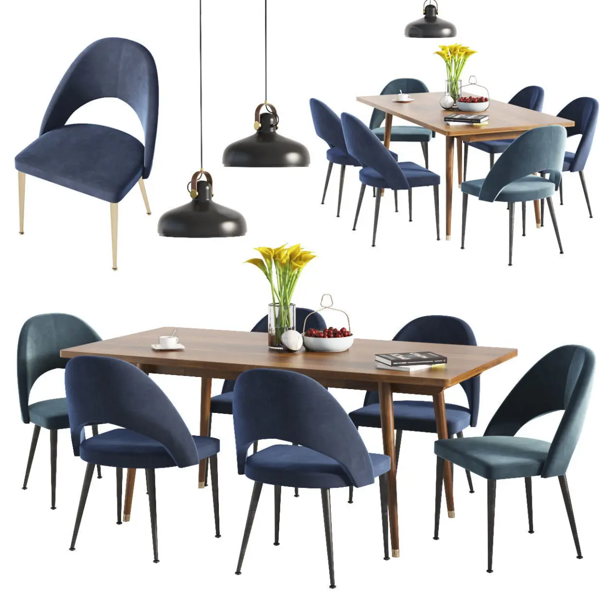 Dinning Set 03The file contains: - Modern Modrest Gloria Blue & Antique Brass Dining Chair (Set of 2)Dimensions: W22x D24 x H33Modrest Gloria Mid-Century Walnut Dining TableW71 x D36x H30Le Klint Carronade Pendant Light LargeDia-40cm X H-27cmMaterials: Polished,Black,White,Wood,Velvet,birch,oak,walnutPlace of use -livingroom / dining room / lounge / kitchen / Bedroom / bar, cafe, restaurant / hotel and hotel /. Archive Contains: -3d max2014Vray 3.20.02Map.objThanks
