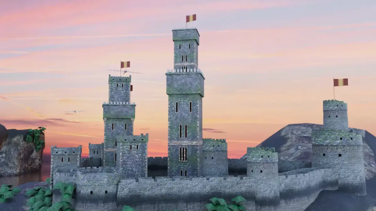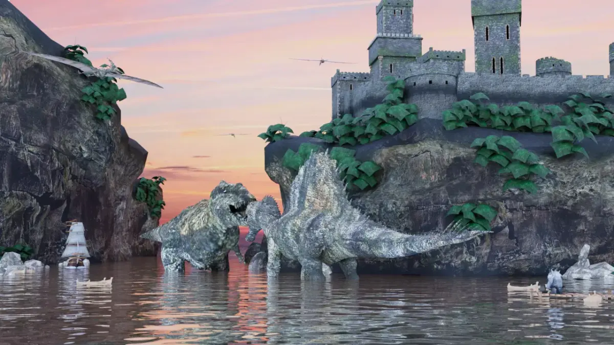 High-quality, game-ready environment combining a fortified medieval castle with prehistoric inhabitants. This scene is professionally optimized for real-time engines (UE5, Unity) and high-end cinematic renders.