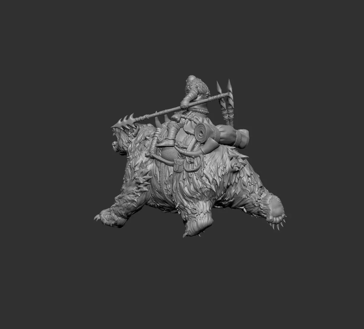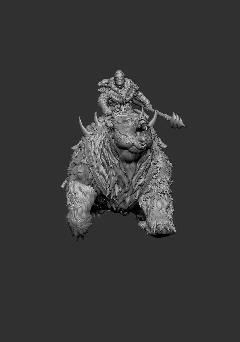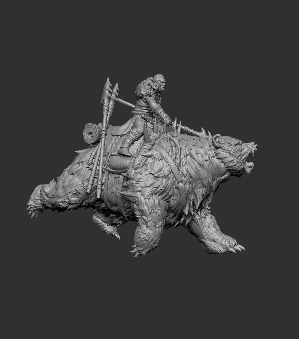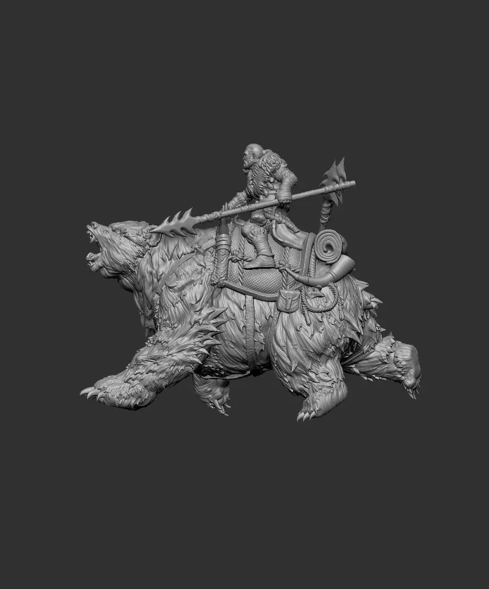 The Dire Bear with Rider miniature is an awe-inspiring representation of a fierce warrior mounted atop a massive, formidable bear. The bear, depicted in a dynamic, mid-run pose, exudes raw power and strength, its fur intricately detailed to convey a sense of realism. The rider, clad in rugged armor and wielding a large, spiked spear, showcases readiness for battle. The equipment and accessories on the bear, including pouches and gear, add to the detailed craftsmanship, making this miniature a captivating addition to any fantasy collection or tabletop game.
