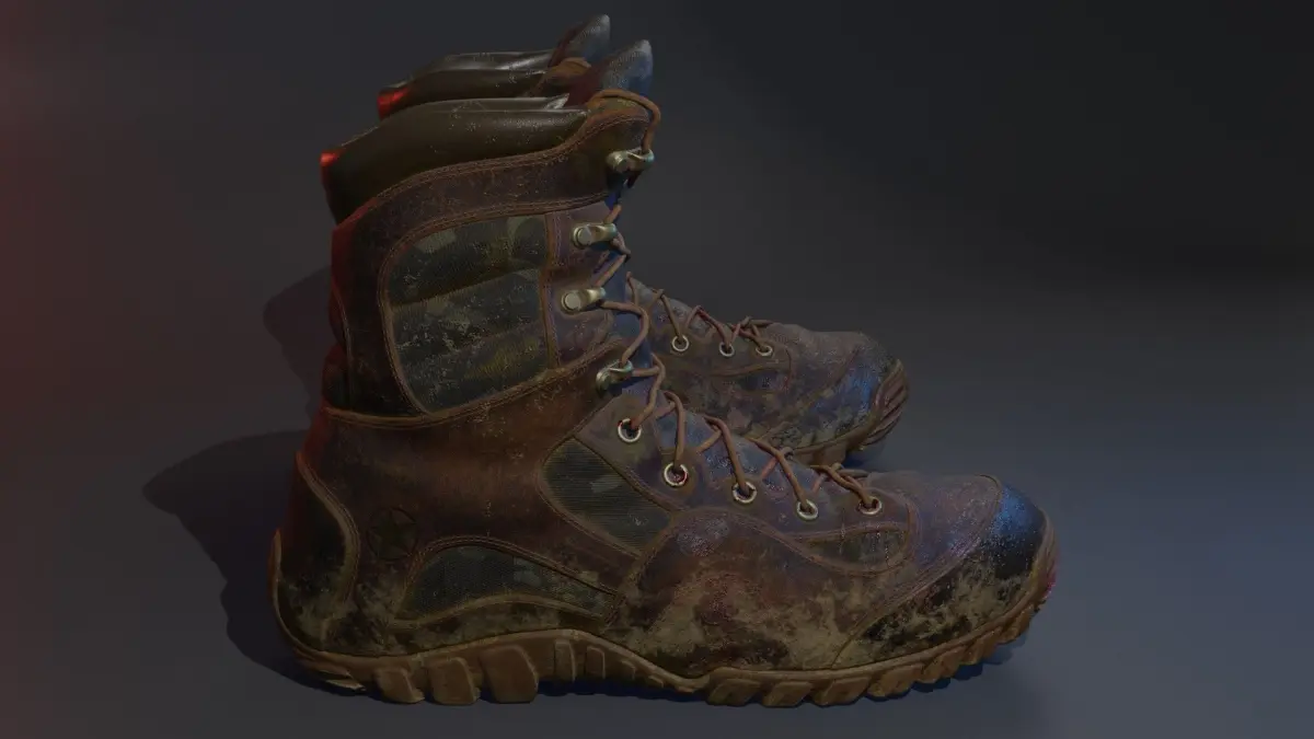 A pair of worn, bloody, muddy combat boots. Textured in Substance Painter, rendered in Blender. This model is great for high-resolution, film-ready characters. Textures are 4K for high-quality renders but can be scaled down if a lower resolution is needed. The boots are unwrapped over six UDIM tiles to maximize texture quality. Each boot is UV mapped separately to ensure uniqueness in the texturing process. These boots were retopologized from a 3D scan of real boots.I have also included the Substance Painter file for you to customize the textures to your liking.