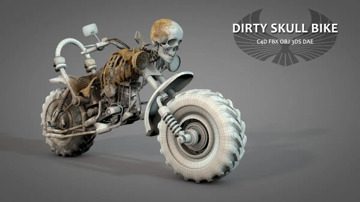 skullbike3.FBX (v7.5) has connected objects and baked textures same as C4D file. This format needs UVTEX folder for materials.