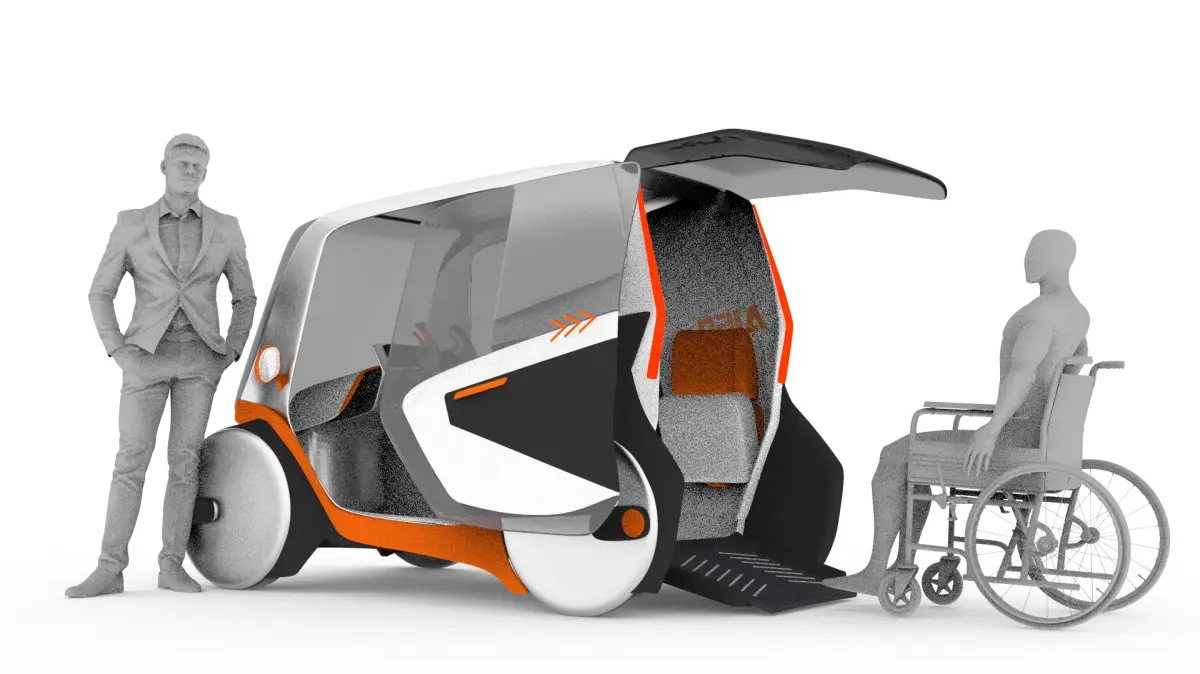 Introducing a revolutionary compact car concept designed to redefine shared mobility with inclusivity and convenience at its core. This adorable yet highly functional vehicle is tailored specifically for individuals with disabilities, particularly those who use wheelchairs, while also catering seamlessly to the needs of able-bodied users.