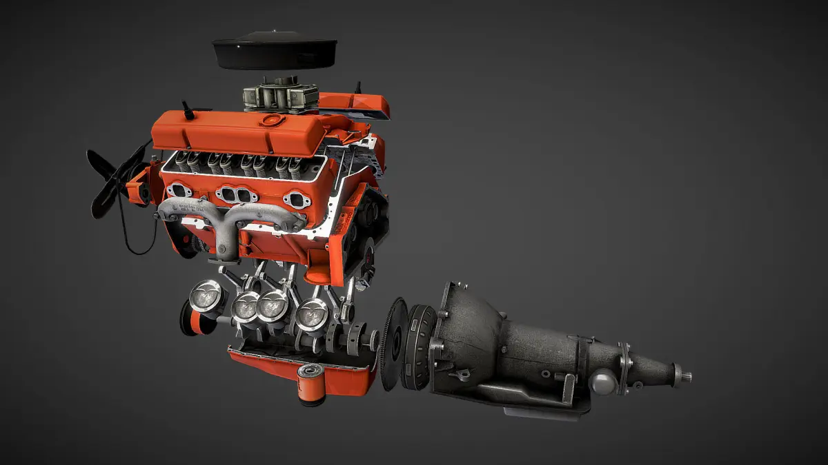 Parts list : 1-V8 small block 2-pistons 3-rods 4-crankshaft 5-oil pan 6-oil filter 7-left head 8-left head cover 9-left head header 10-right head 11-right head cover 12-right head header13-manifold intake 14-holley carburetor 15-fuel pomp 16-water pomp 17-alternator 18-timing cover 19-timing chain and gear set 20-drive pulley 21-air cleaner 22-transmission23-clutch 24-torque converter