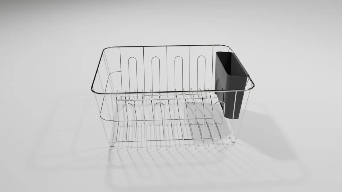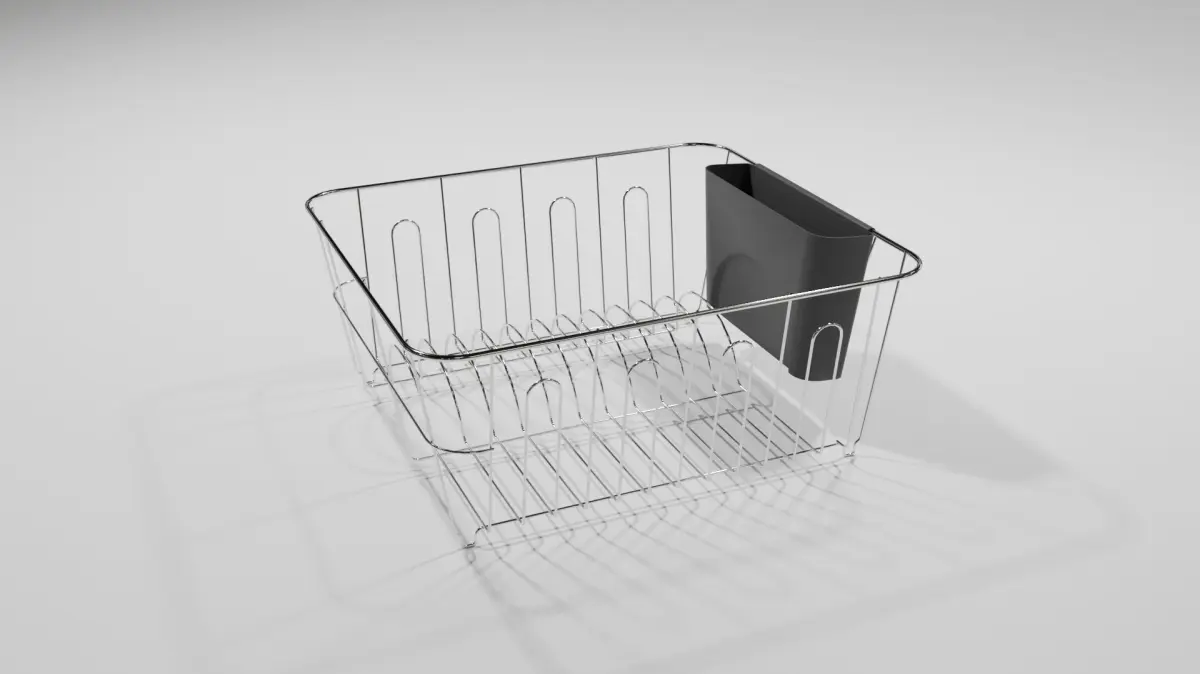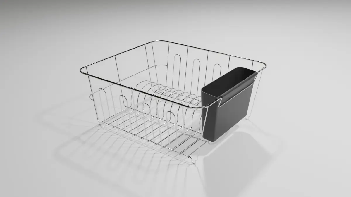 A simple dish rack suitable as a prop for kitchen scenes and architectual visualisations. Comes with a platic container to hold cutlery.