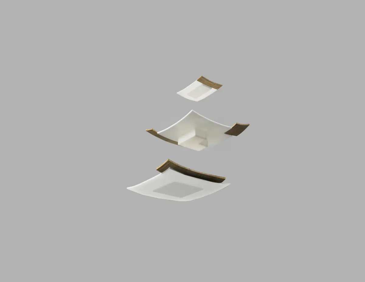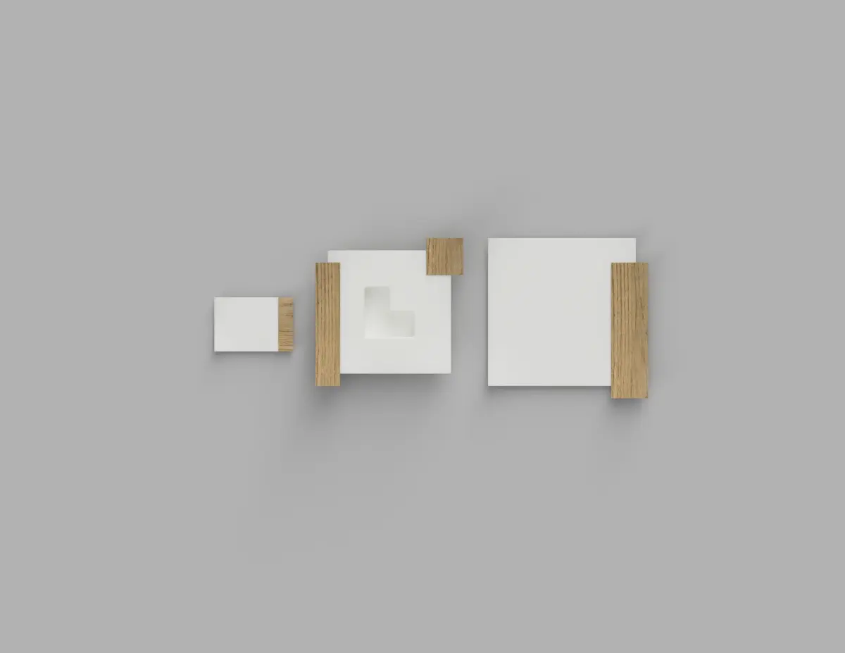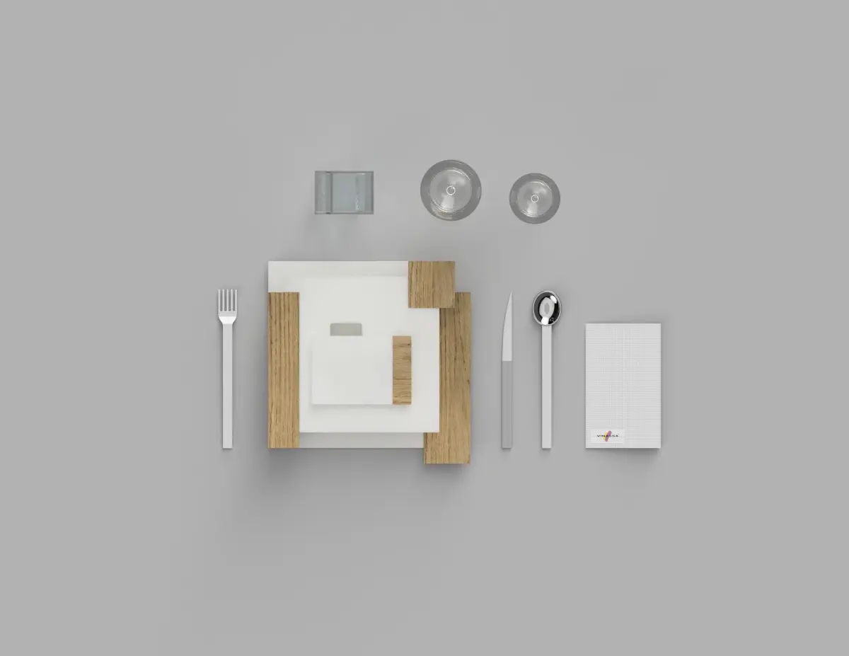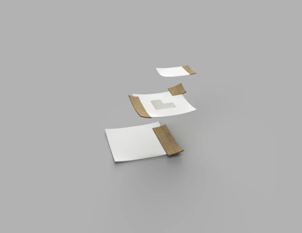 Set of elegant plates with a minimal design in white ceramic and oak wood inserts. The set includes three dishes, one for the appetizer, one for the first and one for the second.