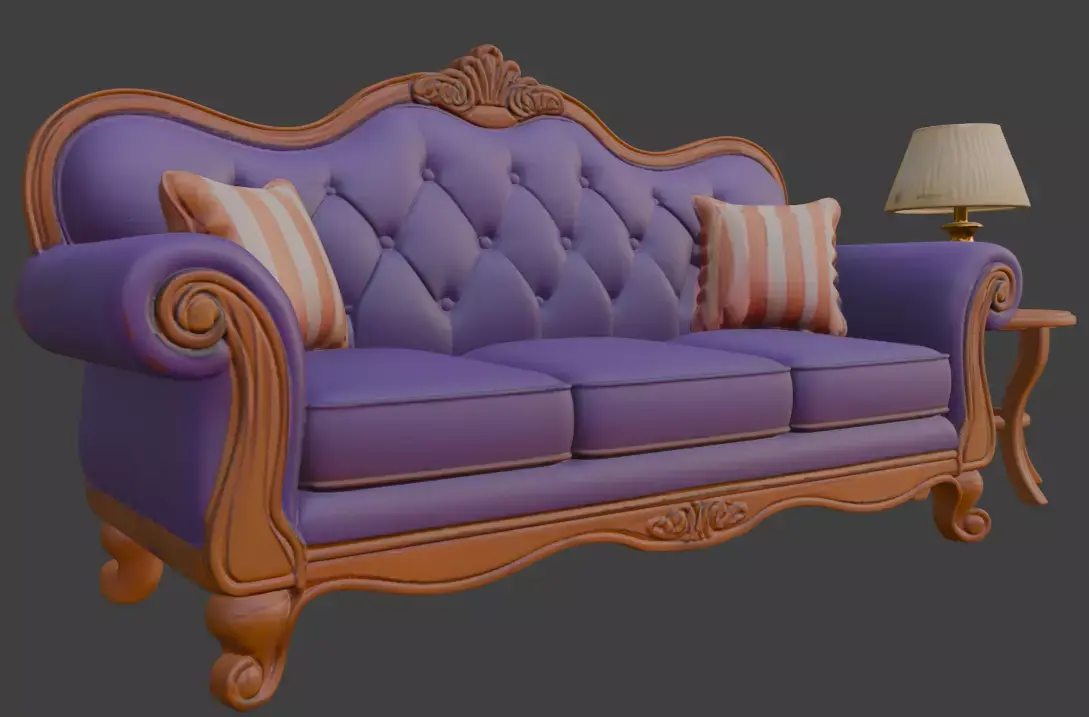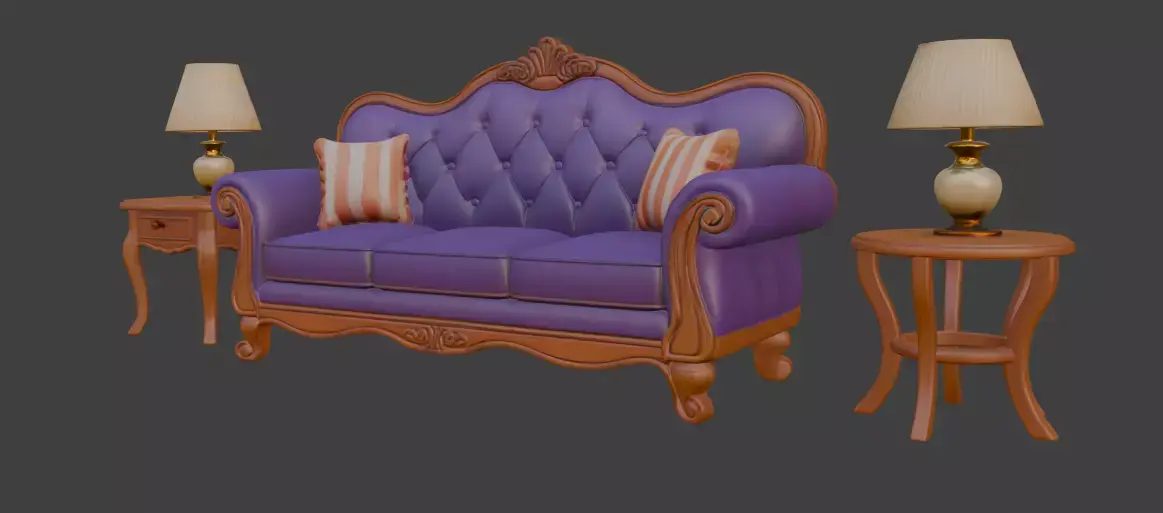 The 3d model showcases a charming Disney-style cartoon 3D model featuring a luxurious purple sofa with ornate wooden accents, complemented by two cozy striped cushions. Flanking the sofa are two elegant wooden side tables, each topped with a classic lamp featuring a beige shade and a gold base. The overall design exudes a vintage and stylish vibe, blending animated charm with classic furniture aesthetics, making it a delightful addition to any whimsical decor setting.